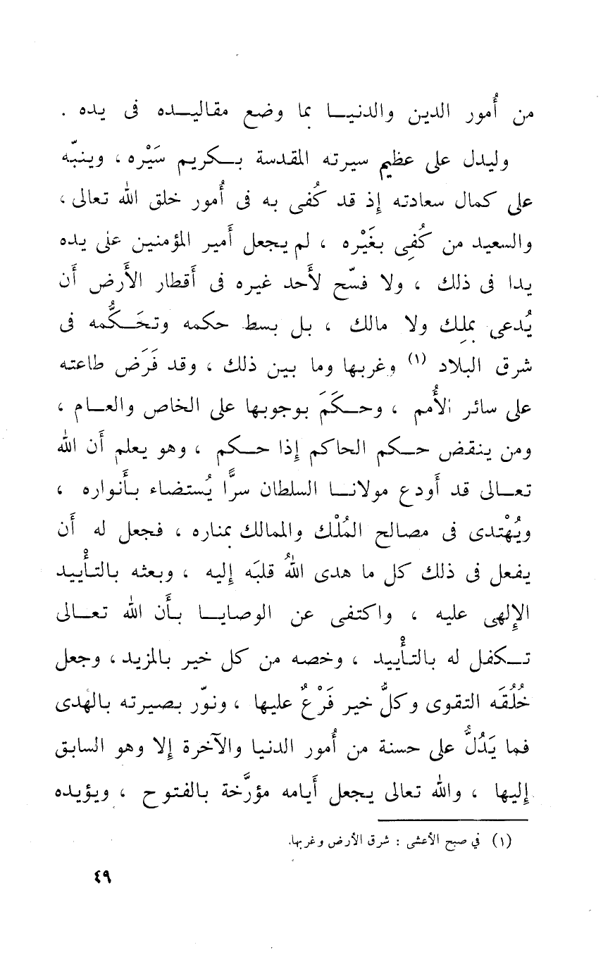 وليدل على عَظِيم سيرته المقدسة بكريم سيره وينبه على كَمَال سعادته إِذْ قد كفى بِهِ فِي أُمُور خلق الله تَعَالَى والسعيد من كفى بِغَيْرِهِ لم يَجْعَل أَمِير الْمُؤمنِينَ على يَده يدا فِي ذَلِك وَلَا فسح لأحد غَيره فِي أقطار الأَرْض أَن يدعى بِملك وَلَا مَالك بل بسط حكمه وتحكمه فِي شَرق الْبِلَاد وغبرها وَمَا بَين ذَلِك وَقد فرض طَاعَته على سَائِر الْأُمَم وَحكم بِوُجُوبِهَا على الْخَاص وَالْعَام وَمن ينْقض حكم الْحَاكِم إِذا حكم وَهُوَ يعلم أَن الله تَعَالَى قد أودع مَوْلَانَا السُّلْطَان سرا يستضاء بأنواره ويهتدى فِي مصَالح الْملك والممالك بمناره فَجعل لَهُ أَن الله تَعَالَى قد أودع مَوْلَانَا السُّلْطَان سرا يستضاء بأنواره ويهتدى فِي مصَالح الْملك والممالك بمناره فَجعل لَهُ أَن يفعل فِي ذَلِك كل مَا هدى الله قلبه إِلَيْهِ وَبَعثه بالتأييد الإلهي عَلَيْهِ وَاكْتفى عَن الْوَصَايَا بِأَن الله تَعَالَى تكفل لَهُ بالتأييد وَخَصه فِي كل خير بالمزيد وَجعل خلقه التَّقْوَى وكل خير فرع عَلَيْهَا وَنور بصيرته بِالْهدى فَمَا يدل على حسنه من أُمُور الدُّنْيَا وَالْآخِرَة إِلَّا وَهُوَ السَّابِق إِلَيْهَا وَالله تَعَالَى يَجْعَل أَيَّامه مؤرخة بالفتوح وَيُؤَيِّدهُ