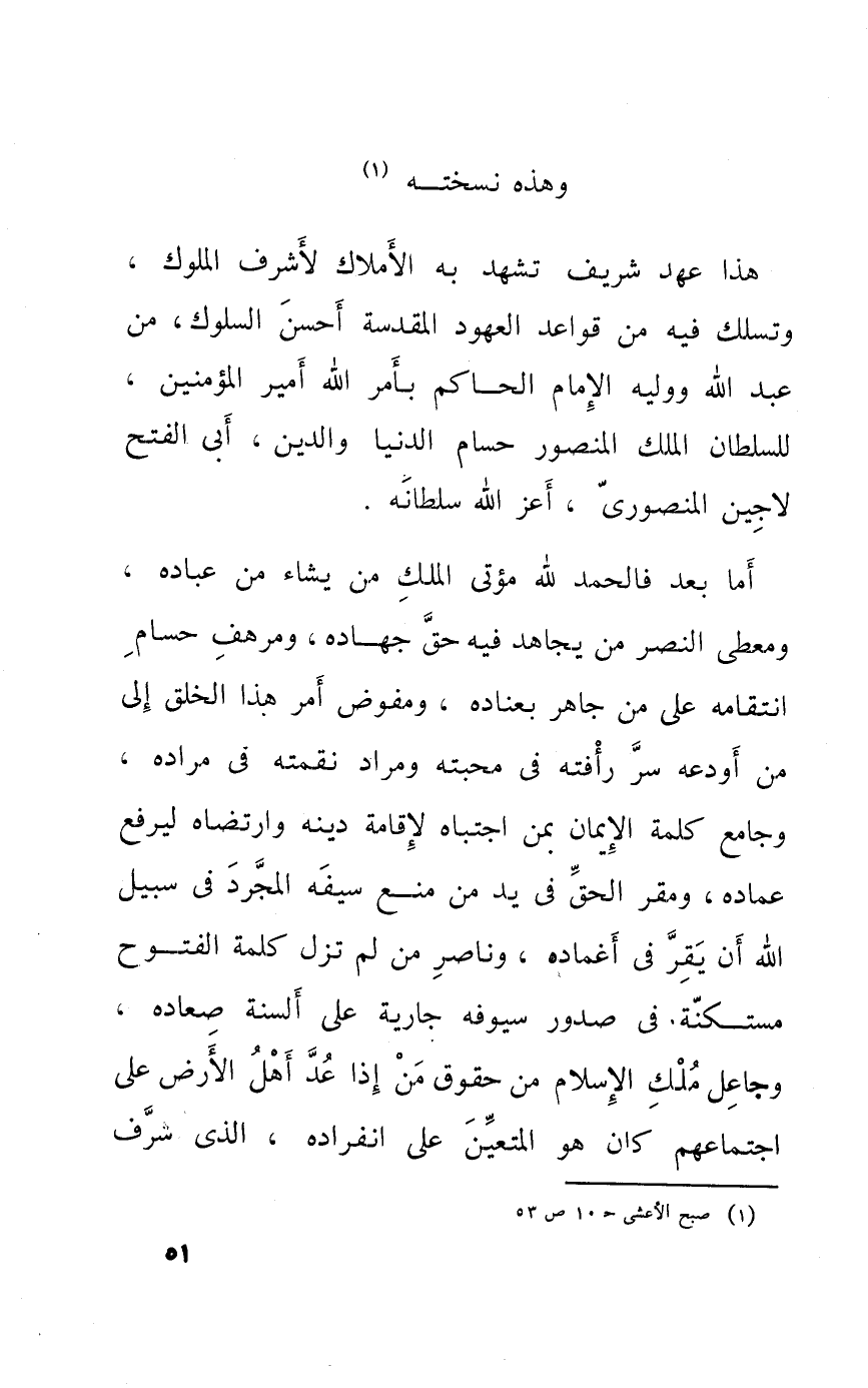 أما بعد فَالْحَمْد لله مؤتى الْملك من يَشَاء من عباده ومعطي النَّصْر من يُجَاهد فِيهِ حق جهاده ومرهف حسام انتقامه على من جاهر بعناده ومفوض أَمر هَذَا الْخلق إِلَى من أودعهُ سر رأفته فِي محبته وَمُرَاد نقمته فِي مُرَاده وجامع كلمة الْإِيمَان بِمن اجتباه لإِقَامَة دينه وارتضاه ليرْفَع عماده ومقر الْحق فِي يَد من منع سَيْفه الْمُجَرّد فِي سَبِيل الله أَن يقر فِي أغماده وناصر من لم تزل كلمة الْفتُوح مستكنة فِي صُدُور سيوفه جَارِيَة على أَلْسِنَة صعاده وجاعل ملك الْإِسْلَام من حُقُوق من إِذا عد أهل الأَرْض على اجْتِمَاعهم كَانَ هُوَ الْمُتَعَيّن على انْفِرَاده الَّذِي شرف
