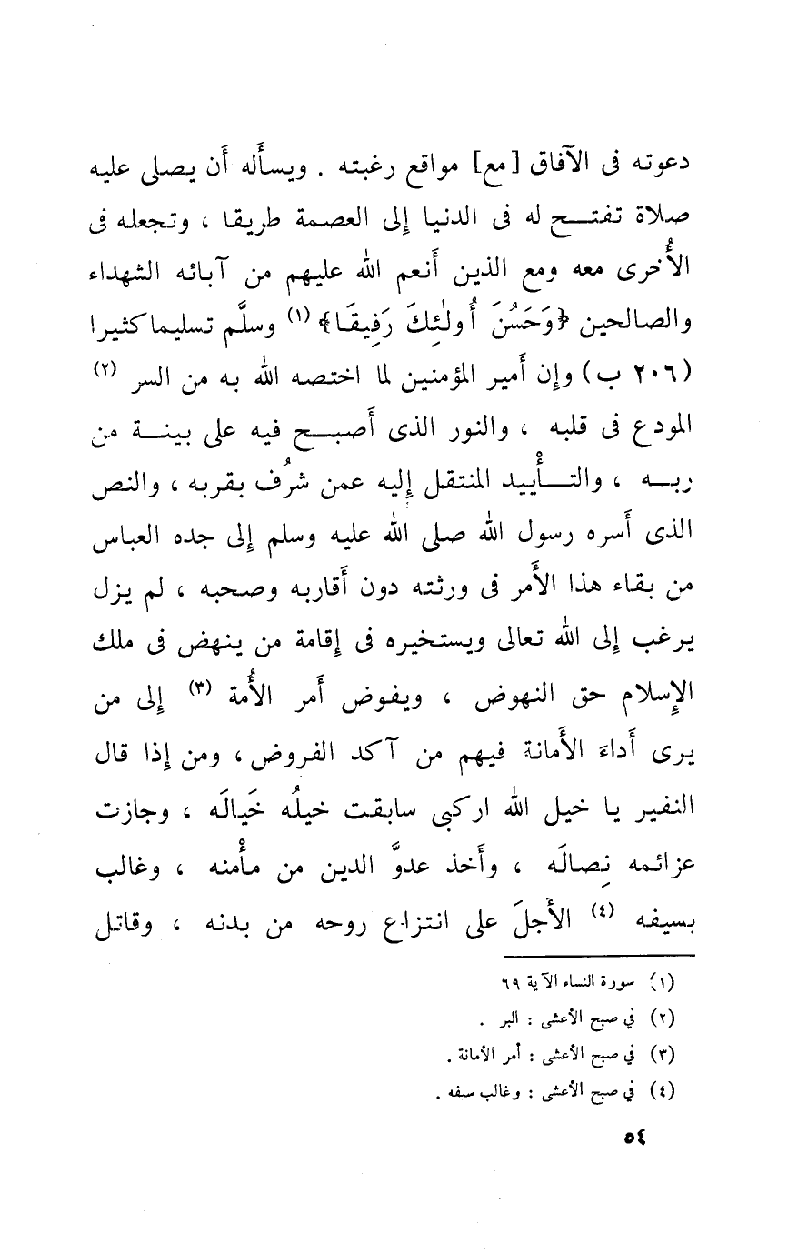دَعوته فِي الْآفَاق مَعَ مواقع رغبته ويسأله أَن يُصَلِّي عَلَيْهِ صَلَاة تفتح لَهُ فِي الدُّنْيَا إِلَى الْعِصْمَة طَرِيقا وتجعله فِي الْأُخْرَى مَعَه وَمَعَ الَّذين أنعم الله عَلَيْهِم من آبَائِهِ الشُّهَدَاء وَالصَّالِحِينَ {وَحسن أُولَئِكَ رَفِيقًا} وَسلم تَسْلِيمًا كثيرا 206 ب وَإِن أَمِير الْمُؤمنِينَ لما اختصه الله بِهِ من السِّرّ الْمُودع فِي قلبه والنور الَّذِي أصبح فِيهِ على بَيِّنَة من ربه والتأييد الْمُنْتَقل إِلَيْهِ عَمَّن شرف بِقُرْبِهِ وَالنَّص الَّذِي أسره رَسُول الله صلى الله عَلَيْهِ وَسلم إِلَى جده الْعَبَّاس من بَقَاء هَذَا الْأَمر فِي ورثته دون أَقَاربه وَصَحبه لم يزل يرغب إِلَى الله تَعَالَى ويستخيره فِي إِقَامَة من ينْهض فِي ملك الْإِسْلَام حق النهوض ويفوض أَمر الْأمة إِلَى من يرى أَدَاء الْأَمَانَة فيهم من آكِد الْفُرُوض وَمن إِذا قَالَ النفير يَا خيل الله ارْكَبِي سابقت خيله خياله وَجَازَت عَزَائِمه نصاله وَأخذ عَدو الدّين من مأمنه وغالب بِسَيْفِهِ الْأَجَل على انتزاع روحه من بدنه وَقَاتل