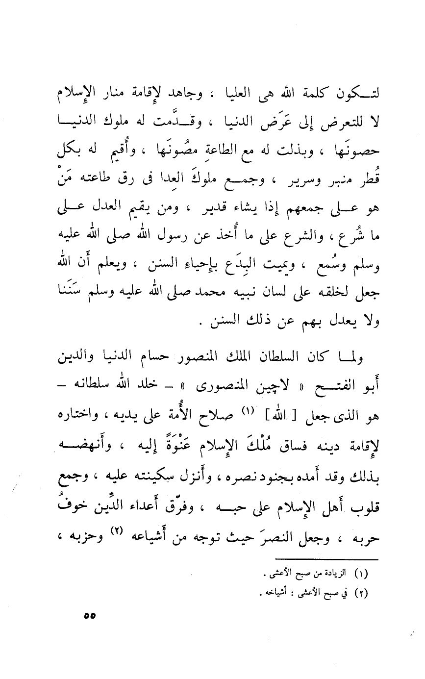 لتَكون كلمة الله هِيَ الْعليا وجاهد لإِقَامَة منار الْإِسْلَام لَا للتعرض إِلَى عرض الدُّنْيَا وقدمت لَهُ مُلُوك الدُّنْيَا حصونها وبذلت لَهُ مَعَ الطَّاعَة مصونها وأقيم لَهُ بِكُل قطر مِنْبَر وسرير وَجمع مُلُوك العدا فِي رق طَاعَته من هُوَ على جمعهم إِذا يَشَاء قدير وَمن يُقيم الْعدْل على مَا شرع وَالشَّرْع على مَا أَخذ عَن رَسُول الله صلى الله عَلَيْهِ وَسلم وَسمع وَيُمِيت الْبدع بإحياء السّنَن وَيعلم أَن الله جعل لخلقه على لِسَان نبيه مُحَمَّد صلى الله عَلَيْهِ وَسلم سننا وَلَا يعدل بهم عَن ذَلِك السّنَن
