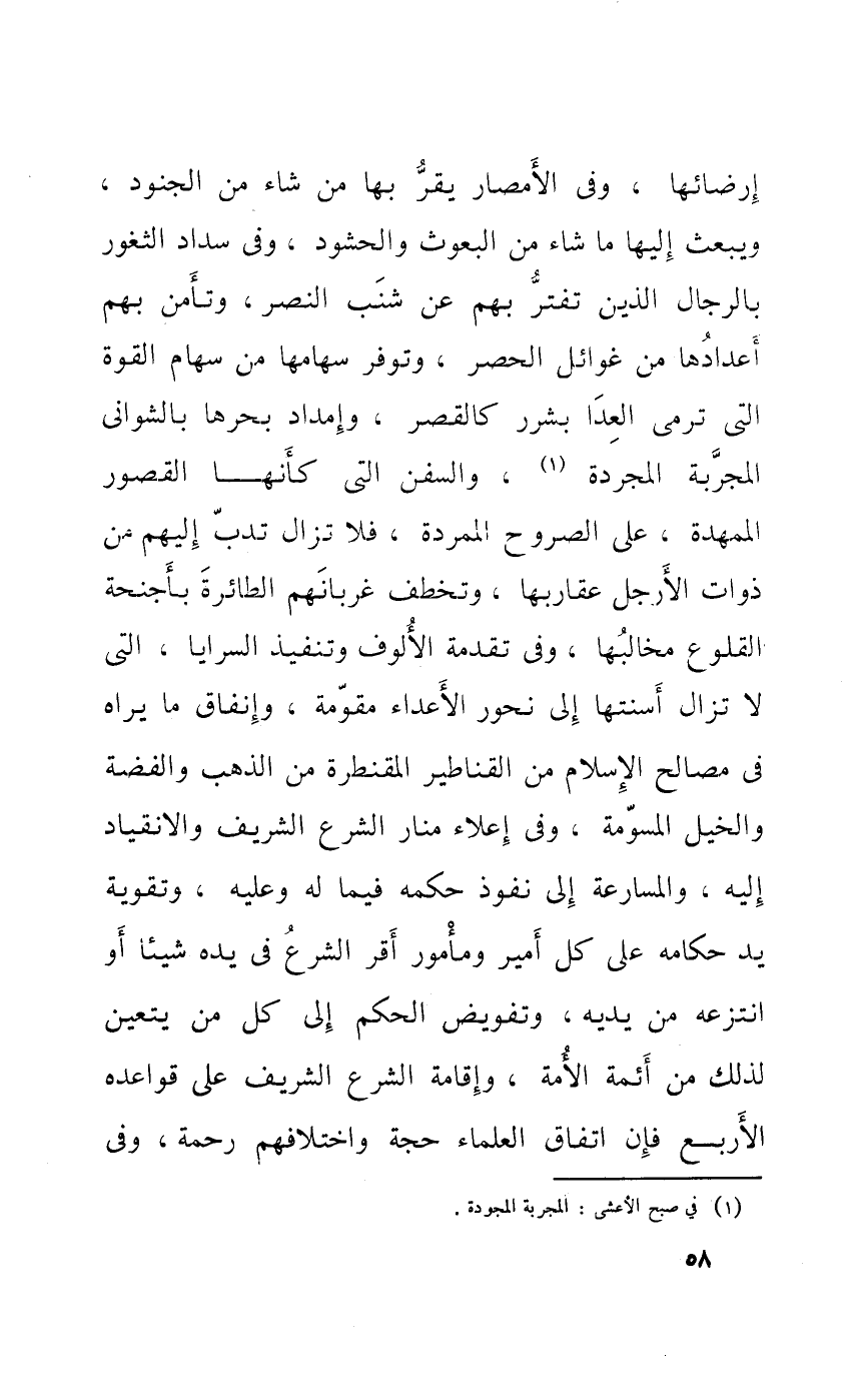 إرضائها وَفِي الْأَمْصَار يقر بهَا من شَاءَ من الْجنُود وَيبْعَث إِلَيْهَا مَا شَاءَ من الْبعُوث والحشود وَفِي سداد الثغور بِالرِّجَالِ الَّذين تفتر بهم عَن شنب النَّصْر وتأمن بهم أعدادها من غوائل الْحصْر وتوفر سهامها من سِهَام الْقُوَّة الَّتِي ترمي العدا بشرر كالقصر وإمداد بحرها بالشواني المجربة الْمُجَرَّدَة والسفن الَّتِي كَأَنَّهَا الْقُصُور الممهدة على الصروح الممردة فَلَا تزَال تدب إِلَيْهِم من ذَوَات الأرجل عقاربها وتخطف غربانهم الطائرة بأجنحة القلوع مخالبها وَفِي تقدمة الألوف وتنفيذ السَّرَايَا الَّتِي لَا تزَال أسنتها إِلَى نحور الْأَعْدَاء مقومة وإنفاق مَا يرَاهُ فِي مصَالح الْإِسْلَام من القناطير المقنطرة من الذَّهَب وَالْفِضَّة وَالْخَيْل المسومة وَفِي إعلاء منار الشَّرْع الشريف والانقياد إِلَيْهِ والمسارعة إِلَى نُفُوذ حكمه فِيمَا لَهُ وَعَلِيهِ وتقوية يَد حكامه على كل أَمِير ومأمور أقرّ الشَّرْع فِي يَده شَيْئا أَو انتزعه من يَدَيْهِ وتفويض الحكم إِلَى كل من يتَعَيَّن لذَلِك من أَئِمَّة الْأمة وَإِقَامَة الشَّرْع الشريف على قَوَاعِده الْأَرْبَع فَإِن اتِّفَاق الْعلمَاء حجَّة وَاخْتِلَافهمْ رَحْمَة وَفِي