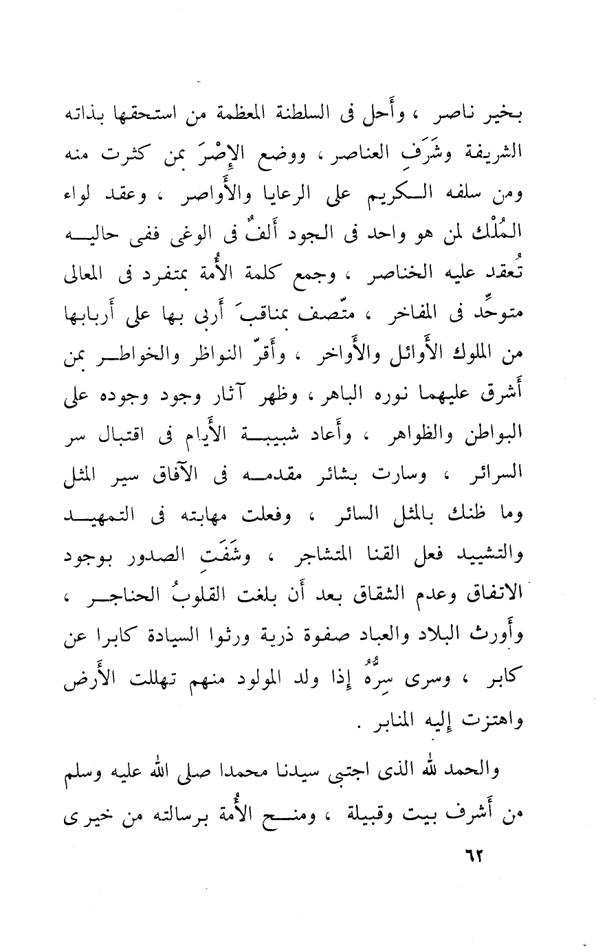 بِخَير نَاصِر وَأحل فِي السلطنة المعظمة من اسْتحقَّهَا بِذَاتِهِ الشَّرِيفَة وَشرف العناصر وَوضع الإصر بِمن كثرت مِنْهُ وَمن سلفه الْكَرِيم على الرعايا والأواصر وَعقد لِوَاء الْملك لمن هُوَ وَاحِد فِي الْجُود ألف فِي الوغى فَفِي حاليه تعقد عَلَيْهِ الخناصر وَجمع كلمة الْأمة بمتفرد فِي الْمَعَالِي متوحد فِي المفاخر متصف بمناقب أربى بهَا على أَرْبَابهَا من الْمُلُوك الْأَوَائِل والأواخر وَأقر النواظر والخواطر بِمن أشرق عَلَيْهِمَا نروه الباهر وَظهر آثَار وجود وجوده على البواطن والظواهر وَأعَاد شبيبة الْأَيَّام فِي اقتبال سر السرائر وسارت بشائر مقدمه فِي الْآفَاق سير الْمثل وَمَا ظَنك بِالْمثلِ السائر وَفعلت مهابته فِي التَّمْهِيد والتشييد فعل القنا المتشاجر وشفت الصُّدُور بِوُجُود الِاتِّفَاق وَعدم الشقاق بعد أَن بلغت الْقُلُوب الْحَنَاجِر وأورث الْبِلَاد والعباد صفة ذُرِّيَّة ورثوا السِّيَادَة كَابِرًا عَن كَابر وسرى سره إِذا ولد الْمَوْلُود مِنْهُم تهللت الأَرْض واهتزت إِلَيْهِ المنابر