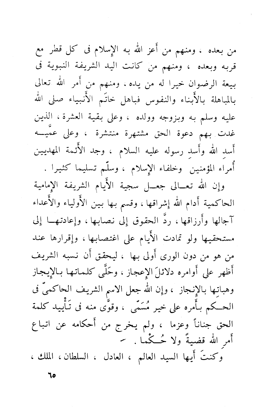 من بعده وَمِنْهُم من أعز الله بِهِ الْإِسْلَام فِي كل قطر مَعَ قربه وَبعده وَمِنْهُم من كَانَت الْيَد الشَّرِيفَة النَّبَوِيَّة فِي بيعَة الرضْوَان خيرا لَهُ من يَده وَمِنْهُم من أَمر الله تَعَالَى بالمباهلة بالأبناء والنفوس فباهل خَاتم الْأَنْبِيَاء صلى الله عَلَيْهِ وَسلم بِهِ وبزوجه وَولده وعَلى بَقِيَّة الْعشْرَة الَّذين غَدَتْ بهم دَعْوَة الْحق مشتهرة منتشرة وعَلى عميه أَسد الله وَأسد رَسُوله عَلَيْهِ السَّلَام وجد الْأَئِمَّة المهديين أُمَرَاء الْمُؤمنِينَ وخلفاء الْإِسْلَام وَسلم تَسْلِيمًا كثيرا