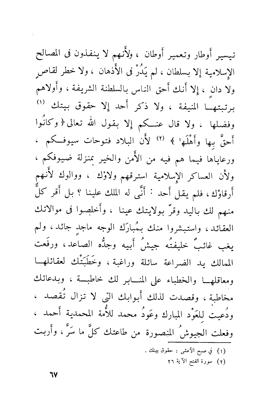تيسير أوطار وتعمير أوطان وَلِأَنَّهُم لَا ينفذون فِي الْمصَالح الإسلامية إِلَّا بسُلْطَان لم يدر فِي الأذهان وَلَا خطر لقاص وَلَا دَان إِلَّا أَنَّك أَحَق النَّاس بالسلطنة الشَّرِيفَة وأولاهم برتبتها المنيفة وَلَا ذكر أحد إِلَّا حُقُوق بَيْتك وفضلها وَلَا قَالَ عَنْك إِلَّا بقول الله تَعَالَى {وَكَانُوا أَحَق بهَا وَأَهْلهَا} لِأَن الْبِلَاد فتوحات سُيُوفكُمْ ورعاياها فِيمَا هم فِيهِ من الْأَمْن وَالْخَيْر بِمَنْزِلَة ضيوفكم وَلِأَن العساكر الإسلامية استرقهم ولاؤك ووالوك لأَنهم أرقاؤك فَلم يقل أحد أَنى لَهُ الْملك علينا بل أقرّ كل مِنْهُم لَك بِالْيَدِ وقر بولايتك عينا وَأَخْلصُوا فِي موالاتك العقائد وَاسْتَبْشَرُوا مِنْك بمبارك الْوَجْه ماجد جائد وَلم يغب غَائِب خَلِيفَته جَيش أَبِيه وجده الصاعد وَرفعت الممالك يَد الضراعة سَائِلَة وراغبة وخطبتك لعقائلها ومعاقلها والخطباء على المنابر لَك خاطبة وبدعائك مُخَاطبَة وقصدت لذَلِك أبوابك الَّتِي لَا تزَال تقصد ودعيت للعود الْمُبَارك وعود مُحَمَّد للْأمة المحمدية أَحْمد وَفعلت الجيوش المنصورة من طَاعَتك كل مَا سر وأربت