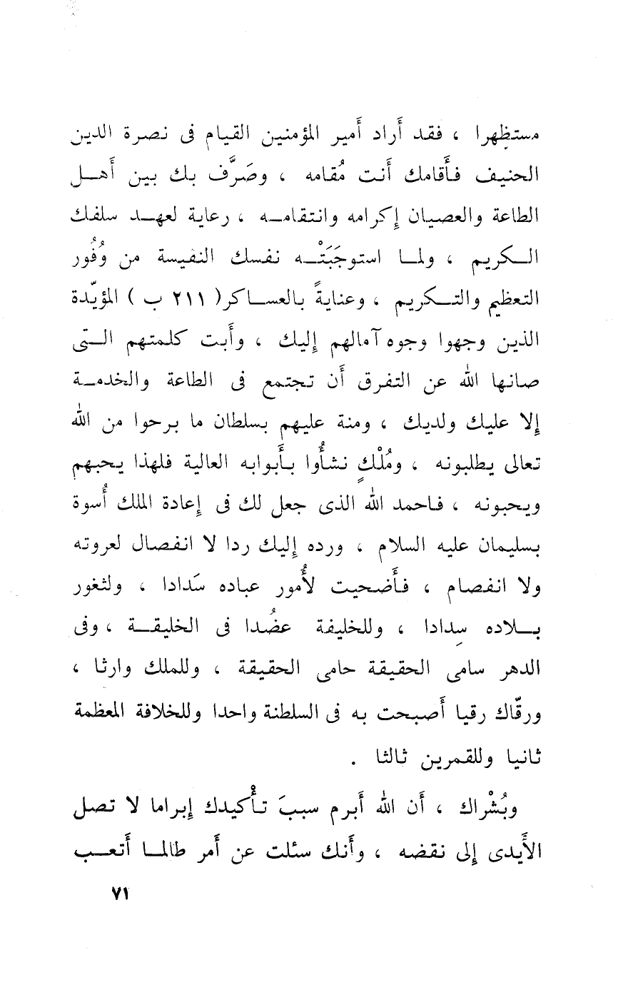 مستظهرا فقد أَرَادَ أَمِير الْمُؤمنِينَ الْقيام فِي نصْرَة الدّين الحنيف فأقامك أَنْت مقَامه وَصرف بك بَين أهل الطَّاعَة والعصيان إكرامه وانتقامه رِعَايَة لعهد سلفك الْكَرِيم لوما استوجبته نَفسك النفيسة من وفور التَّعْظِيم والتكريم وعناية بالعساكر 211 ب المؤيدة الَّذين وجهوا وُجُوه آمالهم إِلَيْك وأبت كلمتهم الَّتِي صانها الله عَن التَّفَرُّق أَن تَجْتَمِع فِي الطَّاعَة والخدمة إِلَّا عَلَيْك ولديك ومنة عَلَيْهِم بسُلْطَان مَا برحوا من الله تَعَالَى يطلبونه وَملك نشأوا بأبوابه الْعَالِيَة فَلهَذَا يُحِبهُمْ وَيُحِبُّونَهُ فاحمد الله الَّذِي جعل لَك فِي إِعَادَة الْملك أُسْوَة بِسُلَيْمَان عَلَيْهِ السَّلَام ورده إِلَيْك ردا لَا انْفِصَال لعروته وَلَا انفصام فأضحيت لأمور عباده سدادا ولثغور بِلَاده سدادا وللخليفة عضدا فِي الخليقة وَفِي الدَّهْر سامي الْحَقِيقَة حامي الْحَقِيقَة وللملك وَارِثا ورقاك رقيا أَصبَحت بِهِ فِي السلطنة وَاحِدًا وللخلافة المعظمة ثَانِيًا وللمقمرين ثَالِثا