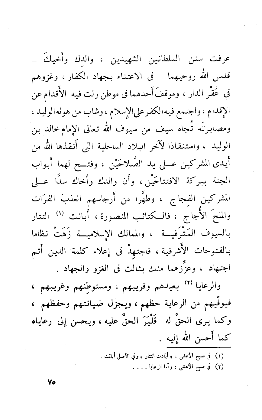 عرفت سنَن السلطانين الشهيدين والدك وأخيك قدس الله روحيهما فِي الاعتناء بجهاد الْكفَّار وغزوهم فِي عقر الدَّار وموقف أَحدهمَا فِي موطن زلت فِيهِ الْأَقْدَام عَن الْإِقْدَام وَاجْتمعَ فِيهِ الْكفْر على الْإِسْلَام وشاب من هوله الْوَلِيد ومصابرته تجاه سيف من سيوف الله تَعَالَى الإِمَام خَالِد بن الْوَلِيد واستنقاذا لآخر الْبِلَاد الساحلية الَّتِي أنقذها الله من أَيدي الْمُشْركين على يَد الصَّالِحين وَفتح لَهما أَبْوَاب الْجنَّة ببركة الافتتاحين وَأَن والدك وأخاك سدا على الْمُشْركين الفجاج وطهرا من أرجاسهم العذب الْفُرَات وَالْملح الأجاج فالكتائب المنصورة أبانت التتار بِالسُّيُوفِ المشرفية والممالك الإسلامية زهت نظاما بالفتوحات الأشرفية فاجتهد فِي إعلاء كلمة الدّين أتم اجْتِهَاد وعززهما مِنْك بثالث فِي الْغَزْو وَالْجهَاد