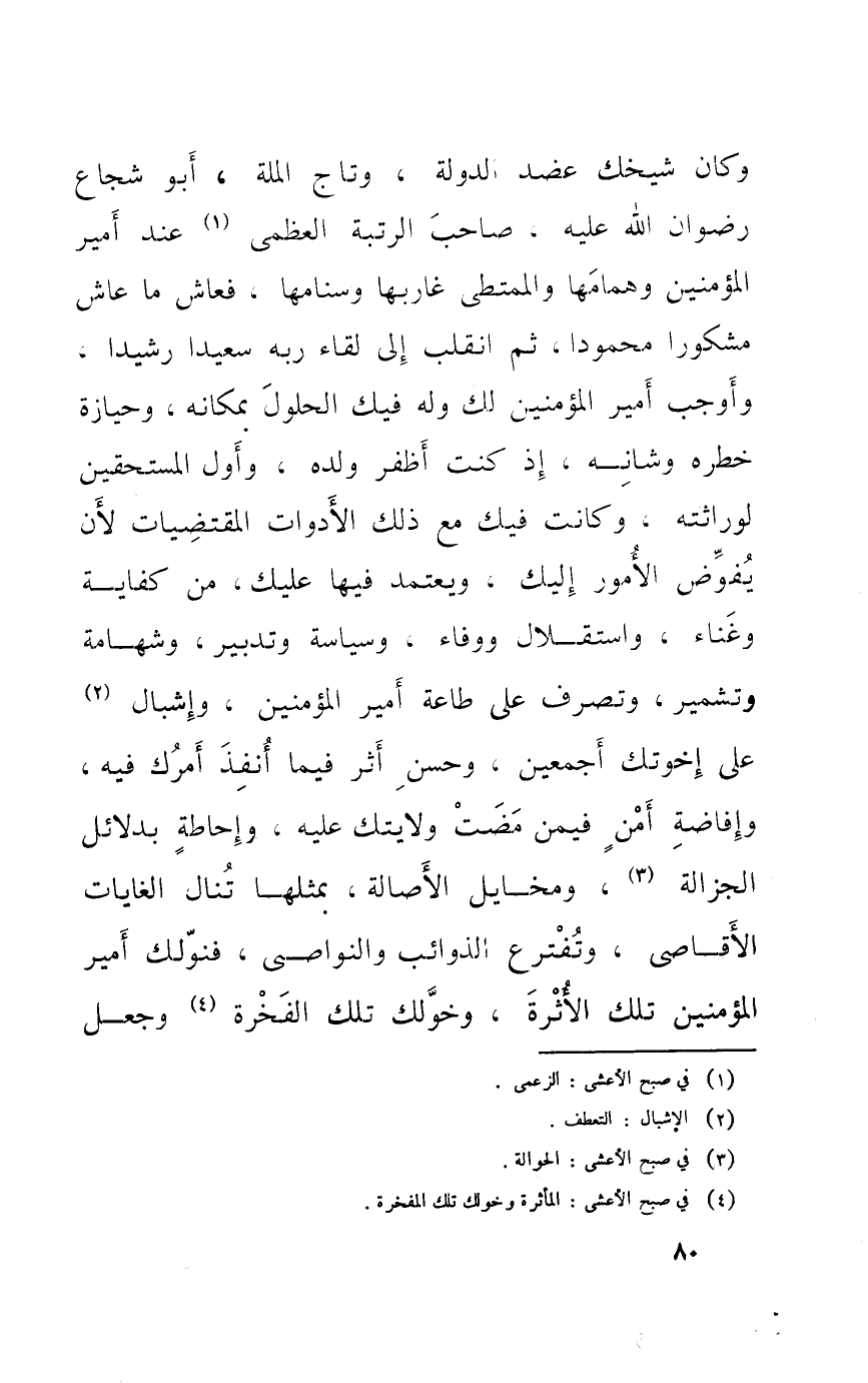 وَكَانَ شيخك عضد الدولة وتاج الْملَّة أَبُو شُجَاع رضوَان الله عَلَيْهِ صَاحب الرُّتْبَة الْعُظْمَى عِنْد أَمِير الْمُؤمنِينَ وهمامها والممتطي غاربها وسنامها فَعَاشَ مَا عَاشَ مشكورا مَحْمُودًا ثمَّ انْقَلب إِلَى لِقَاء ربه سعيدا رشيدا وَأوجب أَمِير الْمُؤمنِينَ لَك وَله فِيك الْحُلُول بمكانه وحيازة خطره وشأنه إِذْ كنت أظفر وَلَده وَأول الْمُسْتَحقّين لوراثته وَكَانَت فِيك مَعَ ذَلِك الأدوات المقتضيات لِأَن يُفَوض الْأُمُور إِلَيْك ويعتمد فِيهَا عَلَيْك من كِفَايَة وغناء واستقلال ووفاء وسياسة وتدبير وشهامة وتشمير وَتصرف على طَاعَة أَمِير الْمُؤمنِينَ وإشبال على إخْوَتك أَجْمَعِينَ وَحسن أثر فِيمَا أنفذ أَمرك فِيهِ وإفاضة أَمن فِيمَن مَضَت ولايتك عَلَيْهِ وإحاطة بدلائل الجزالة ومخايل الْأَصَالَة بِمِثْلِهَا تنَال الغايات الأقاصي وتفترع الذوائب والنواصي فنولك أَمِير الْمُؤمنِينَ تِلْكَ الأثرة وخولك تِلْكَ الفخرة وَجعل