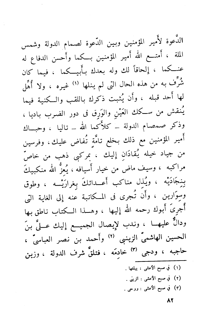 الدعْوَة لأمير الْمُؤمنِينَ وَبَين الدعْوَة لصمام الدولة وشمس الْملَّة أمتع الله أَمِير الْمُؤمنِينَ بكما وَأحسن الدفاع لَهُ عنكما إِلْحَاقًا لَك وَله بعْدك بأبيكما فِيمَا كَانَ شرف بِهِ من هَذِه الْحَال الَّتِي لم ينلها غَيره وَلَا أهل لَهَا أحد قبله وَأَن يثبت ذكرك باللقب والكنية فِيمَا ينقش من سِكَك الْعين وَالْوَرق فِي دور الضَّرْب باديا وَذكر صمصام الدولة كلأكما الله تاليا وحباك أَمِير الْمُؤمنِينَ مَعَ ذَلِك بخلع تَامَّة تفاض عَلَيْك وفرسين من جِيَاد خيله يقادان إِلَيْك بمركبي ذهب من خَاص مراكبه وَسيف مَاض من خِيَار أسيافه يعز الله منكبيك بنجاديه ويذل مناكب أعدائك بغراريه وطوق وسوارين وَأَن تجْرِي فِي الْمُكَاتبَة عَنهُ إِلَى الْغَايَة الَّتِي أجْرى أَبوك رَحمَه الله إِلَيْهَا وَهَذَا الْكتاب نَاطِق بهَا ودال عَلَيْهَا وَندب لإيصال الْجَمِيع إِلَيْك عَليّ بن الْحُسَيْن الْهَاشِمِي الزَّيْنَبِي وَأحمد بن نصر العباسي حَاجِبه ودجى خادمه فتلق شرف الدولة وزين