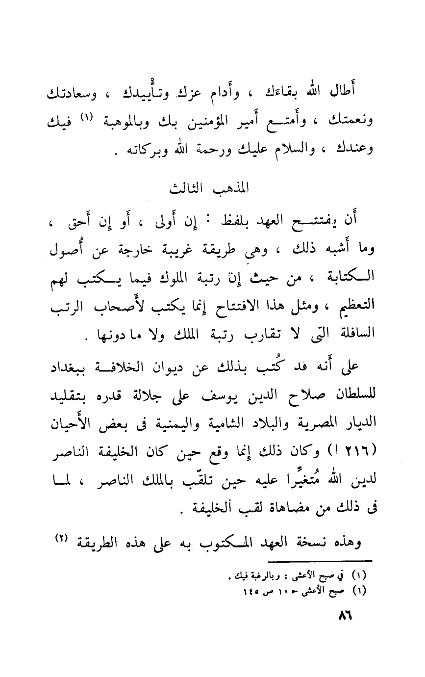 على أَنه قد كتب بذلك إِلَى ديوَان الْخلَافَة بِبَغْدَاد للسُّلْطَان صَلَاح الدّين يُوسُف على جلالة قدره بتقليد الديار المصرية والبلاد الشامية واليمنية فِي بعض الأحيان 216 أَمِير الْمُؤمنِينَ وَكَانَ ذَلِك إِنَّمَا وَقع حِين كَانَ الْخَلِيفَة النَّاصِر لدين الله متغيرا عَلَيْهِ حِين تلقب بِالْملكِ النَّاصِر لما فِي ذَلِك من مضاهاة لقب الْخَلِيفَة