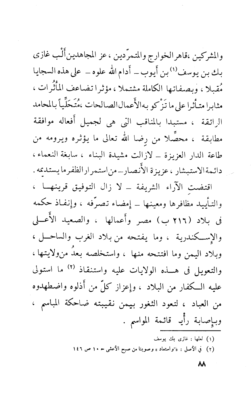 اقْتَضَت الآراء الشَّرِيفَة لَا زَالَ التَّوْفِيق قرينها والتأييد مظافرها ومعينها إِمْضَاء تصرفه وإنفاذ حكمه فِي بِلَاد 216 ب مصر وأعمالها والصعيد الْأَعْلَى والإسكندرية وَمَا يَفْتَحهُ من بِلَاد الغرب والساحل وبلاد الْيمن وَمَا افتتحه مِنْهَا واستخلصه بعد من ولايتها والتعويل فِي هَذِه الولايات عَلَيْهِ واستنقاذ مَا استولى عَلَيْهِ الْكفَّار من الْبِلَاد وإعزاز كل من أذلوه واضطهدوه من الْعباد لتعود الثغور بيمن نقيبته ضاحكة المباسم وبإصابة رَأْيه قَائِمَة المواسم