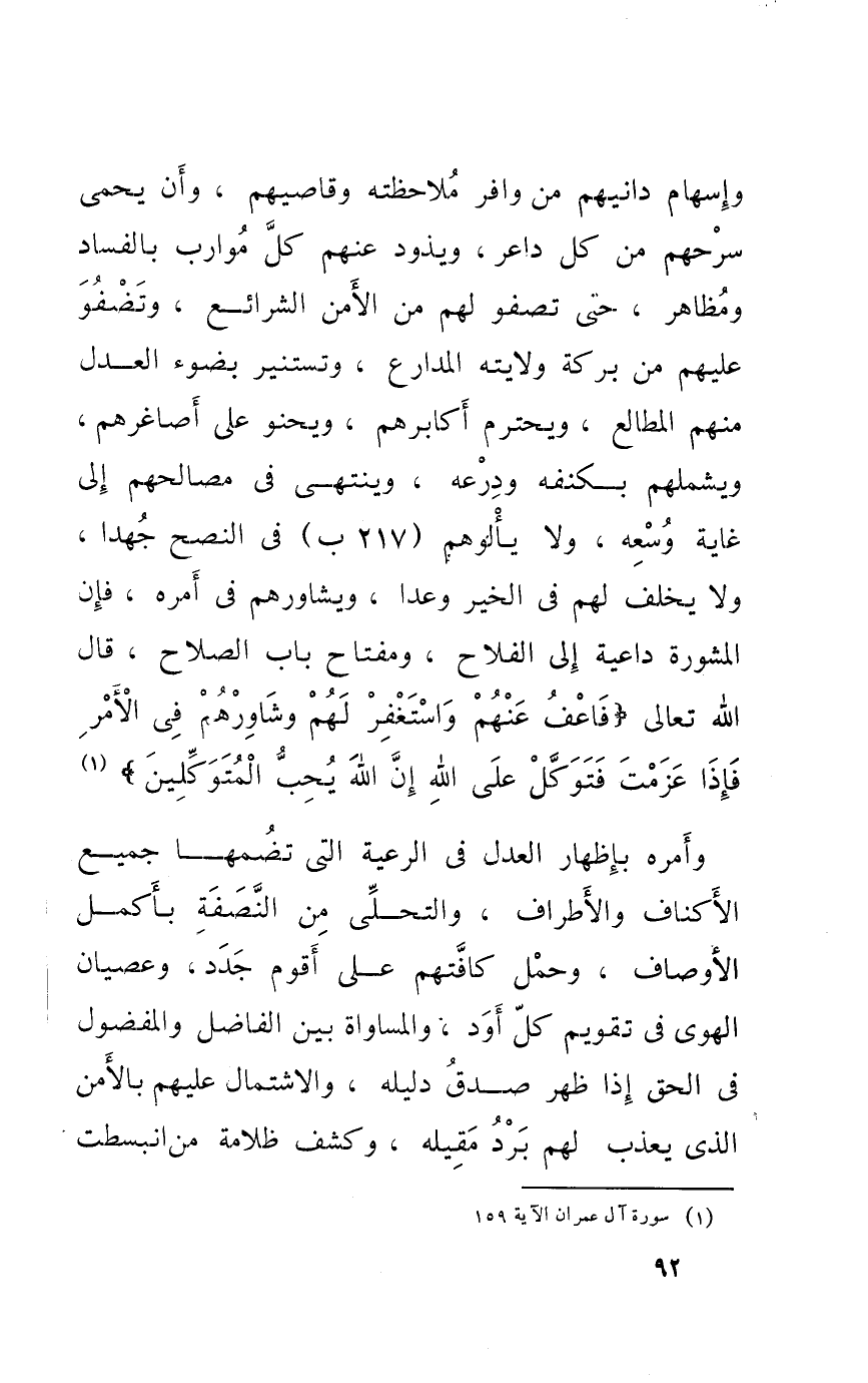 وإسهام دانيهم من وافر ملاحظته وقاصيهم وَأَن يحمي سرحهم من كل داعر ويذود عَنْهُم كل موارب بِالْفَسَادِ وَمظَاهر حَتَّى تصفو لَهُم من الْأَمْن الشَّرَائِع وتضفو عَلَيْهِم من بركَة ولَايَته المدارع وتستنير بضوء الْعدْل مِنْهُم الْمطَالع ويحترم أكابرهم ويحنو على أصاغرهم ويشملهم بكنفه وَدِرْعه وَيَنْتَهِي فِي مصالحهم إِلَى غيه وَسعه وَلَا يألوهم 217 ب فِي النصح جهدا وَلَا يخلف لَهُم فِي الْخَيْر وَعدا ويشاورهم فِي أمره فَإِن المشورة دَاعِيَة إِلَى الْفَلاح ومفتاح بَاب الصّلاح قَالَ الله تَعَالَى {فَاعْفُ عَنْهُم واستغفر لَهُم وشاورهم فِي الْأَمر فَإِذا عزمت فتوكل على الله إِن الله يحب المتوكلين}