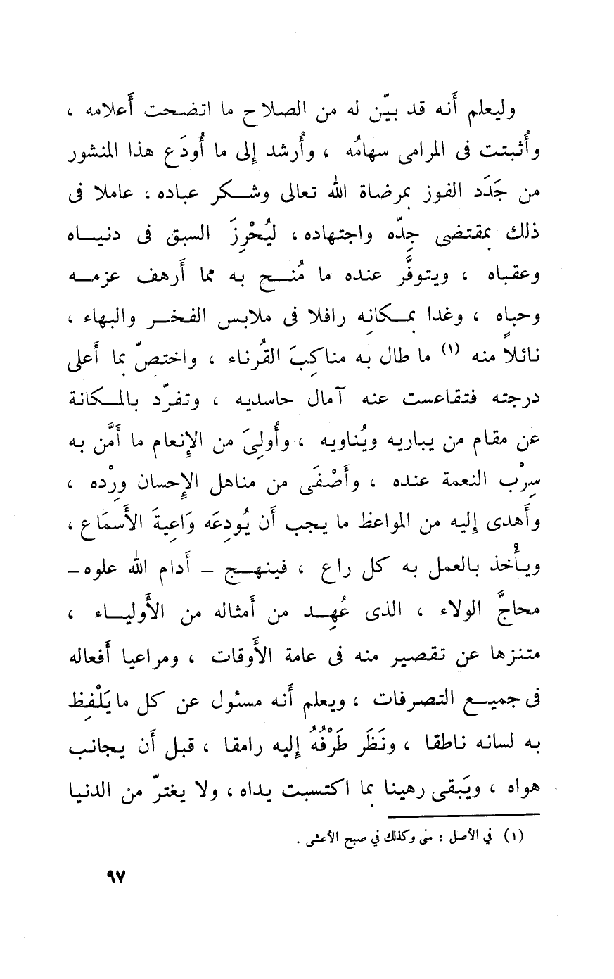وليعلم أَنه قد بَين لَهُ من الصّلاح مَا اتضحت أَعْلَامه وأثبتت فِي المرامي سهامه وأرشد إِلَى مَا أودع هَذَا المنشور من جدد الْفَوْز بمرضاة الله تَعَالَى وشكر عباده عَاملا فِي ذَلِك بِمُقْتَضى جده واجتهاده ليحرز السَّبق فِي دُنْيَاهُ وعقباه ويتوفر عِنْده مَا منح بِهِ مِمَّا أرهف عزمه وحباه وَغدا بمكانه رافلا فِي ملابس الْفَخر والبهاء نائلا مِنْهُ مَا طَال بِهِ مناكب القرناء واختص بِمَا أَعلَى دَرَجَته فَتَقَاعَسَتْ عَنهُ آمال حاسديه وَتفرد بالمكانة عَن مقَام من يباريه ويناويه وَأولى من الإنعام مَا أَمن بِهِ سرب النِّعْمَة عِنْده وأصفى من مناهل الْإِحْسَان ورده وَأهْدى إِلَيْهِ من المواعظ مَا يجب أَن يودعه وَاعِيَة الأسماع وَيَأْخُذ بِالْعَمَلِ بِهِ كل رَاع فينهج أدام الله علوه محاج الْوَلَاء الَّذِي عهد من أَمْثَاله من الْأَوْلِيَاء متنزها عَن تَقْصِير مِنْهُ فِي عَامَّة الْأَوْقَات ومراعيا أَفعاله فِي جَمِيع التَّصَرُّفَات وَيعلم أَنه مسئول عَن كل مَا يلفظ بِهِ لِسَانه ناطقا وَنظر طرفه إِلَيْهِ رامقا قبل أَن يجانب هَوَاهُ وَيبقى رهينا بِمَا اكْتسبت يَدَاهُ وَلَا يغتر من الدُّنْيَا