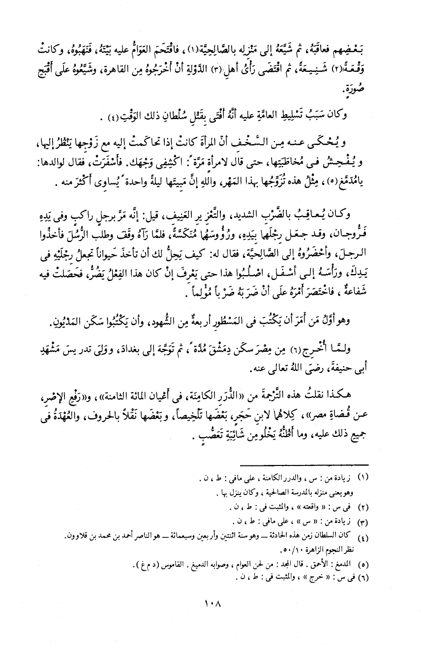 108 بعضهم فعاقبه، ثم شيّعه إلى منزله بالصّالحيّة 1، فاقتحم العوامّ عليه بيته، فنهبوه، و كانت وقعة 2 شنيعة، ثم اقتضى رأى أهل 3 الدّولة أن أخرجوه من القاهرة، و شيّعوه على أقبح صورة.