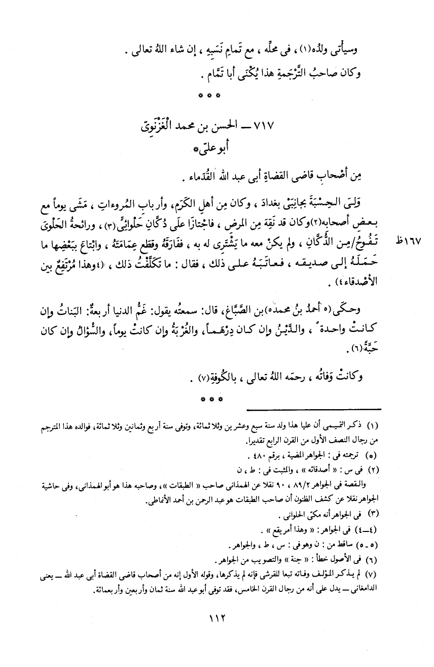 7) لم يذكر المؤلف وفاته تبعا للقرشى فإنه لم يذكرها، و قوله الأول إنه من أصحاب قاضى القضاة أبى عبد اللّه-يعنى الدامغانى-يدل على أنه من رجال القرن الخامس، فقد توفى أبو عبد اللّه سنة ثمان و أربعين و أربعمائة.