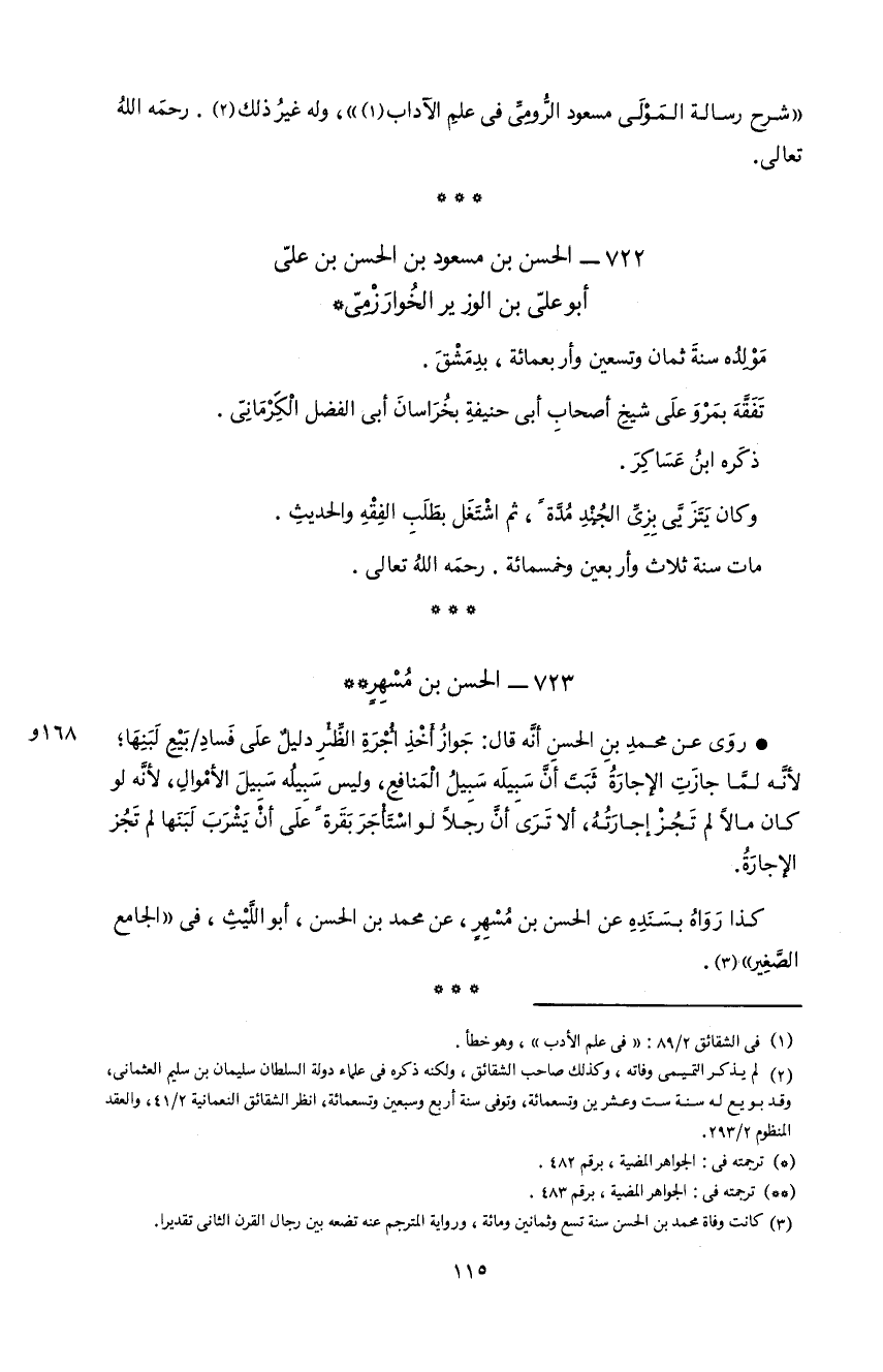 115 «شرح رسالة المولى مسعود الرّومىّ فى علم الآداب 1»، و له غير ذلك 2. رحمه الله تعالى.