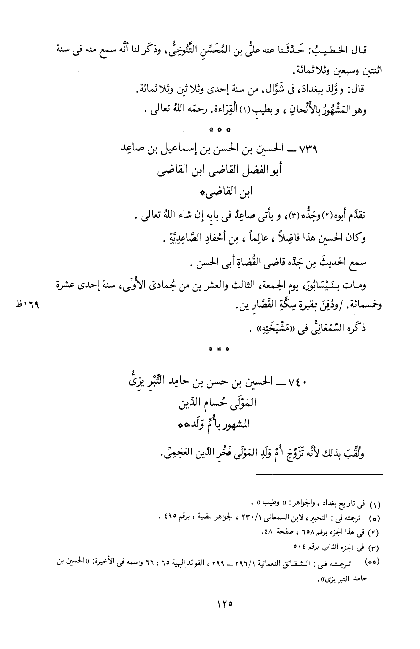 125 قال الخطيب: حدّثنا عنه علىّ بن المحسّن التّنوخىّ، و ذكر لنا أنّه سمع منه فى سنة اثنتين و سبعين و ثلاثمائة.