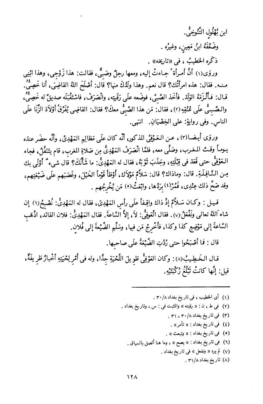و روى أيضا 3، عن العوفىّ المذكور، أنّه كان على مظالم المهدىّ، و أنّه حضر عنده يوما وقت المغرب، و صلّى معه، فلمّا انصرف المهدىّ من صلاة المغرب، قام يتنفّل، فجاء العوفىّ حتى قعد فى قبلته، و جذب ثوبه، فقال له المهدىّ: ما شأنك؟ قال شاء أولى بك من النّافلة. قال: و ما ذاك؟ قال: سلاّم مولاك، أوطأ قوما الخيل، و غصبهم على ضيعتهم، و قد صحّ ذلك عندى، فمر 4 بردّها، و ابعث 5 من يخرجهم.