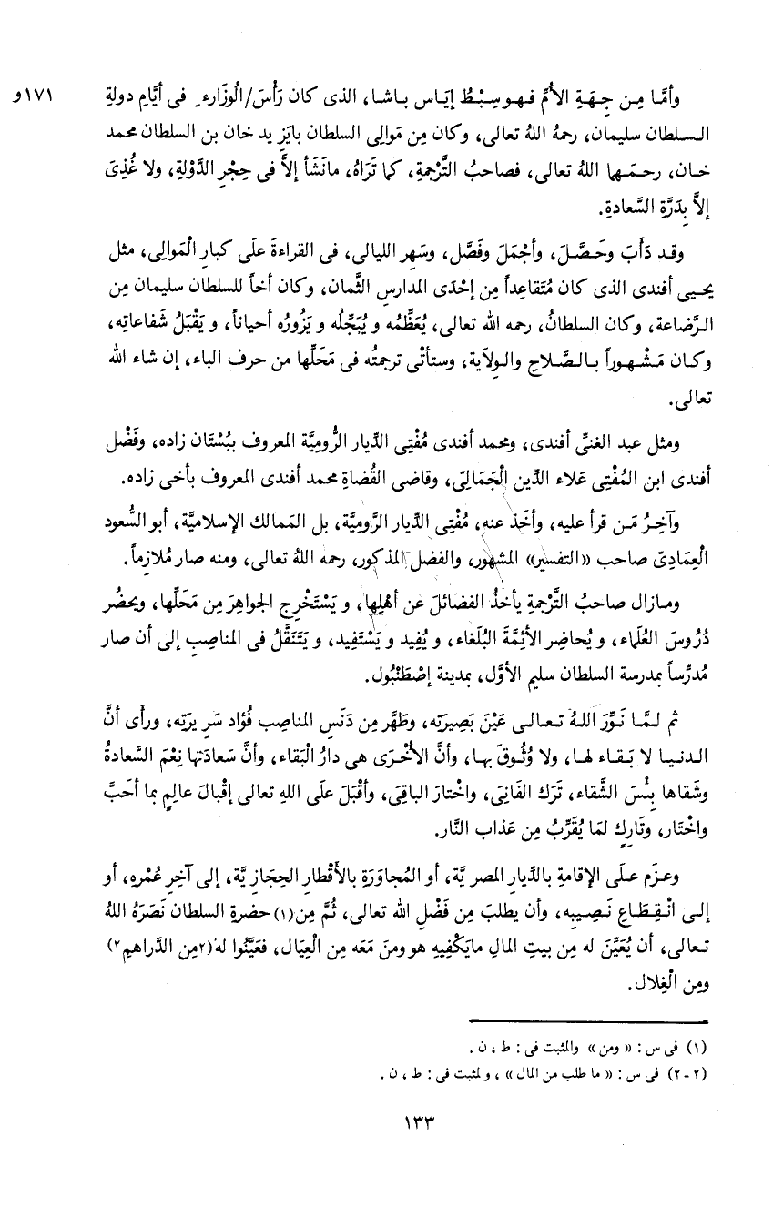 133 و أمّا من جهة الأمّ فهو سبط إياس باشا، الذى كان رأس/الوزارء فى أيّام دولة السلطان سليمان، رحمه الله تعالى، و كان من موالى السلطان بايزيد خان بن السلطان محمد خان، رحمهما الله تعالى، فصاحب التّرجمة، كما تراه، ما نشأ إلاّ فى حجر الدّولة، و لا غذى إلاّ بدرّة السّعادة.