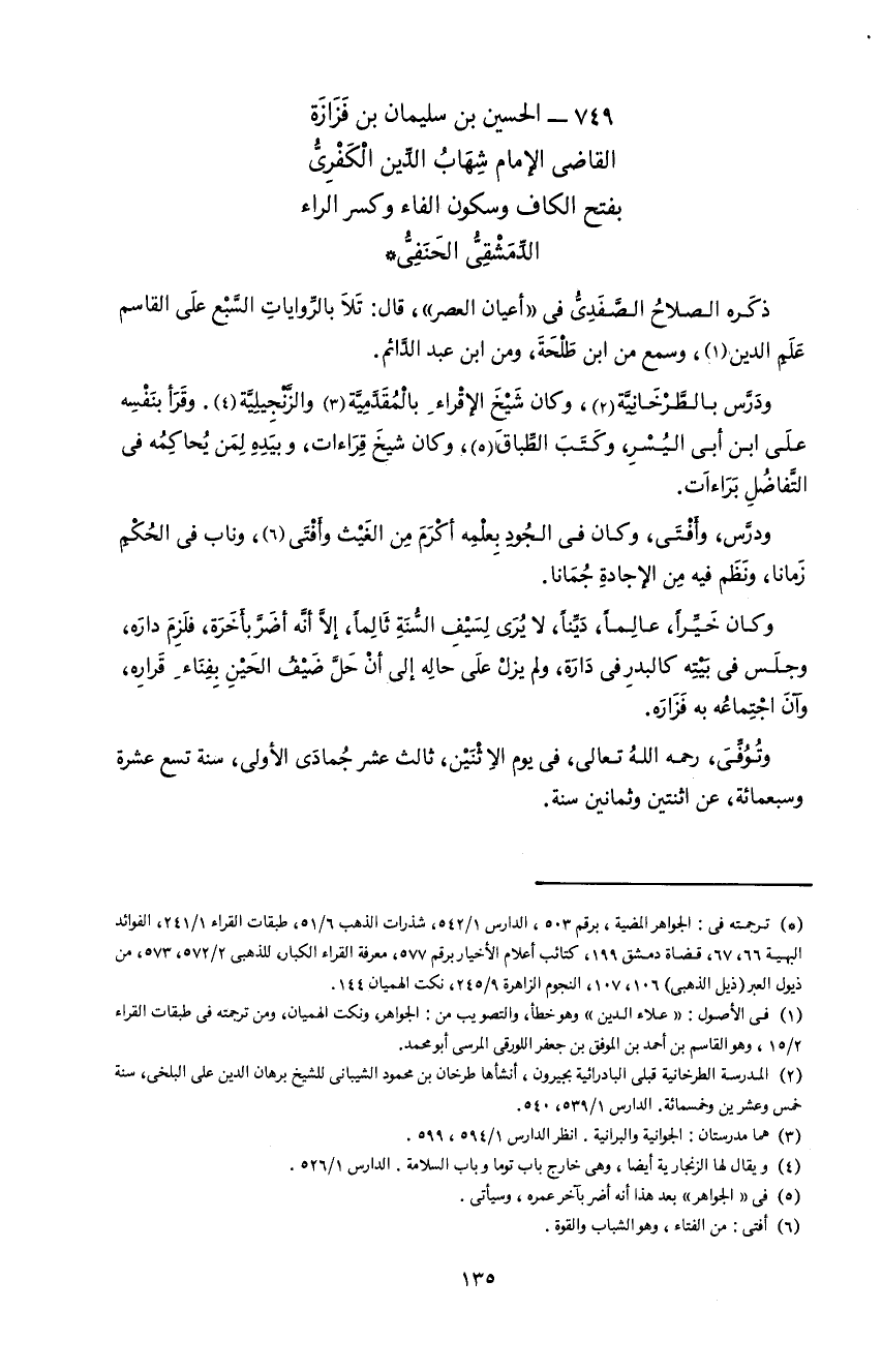 749 - الحسين بن سليمان بن فزازة القاضى الإمام شهاب الدّين الكفرىّ بفتح الكاف و سكون الفاء و كسر الراء الدّمشقىّ الحنفىّ *
