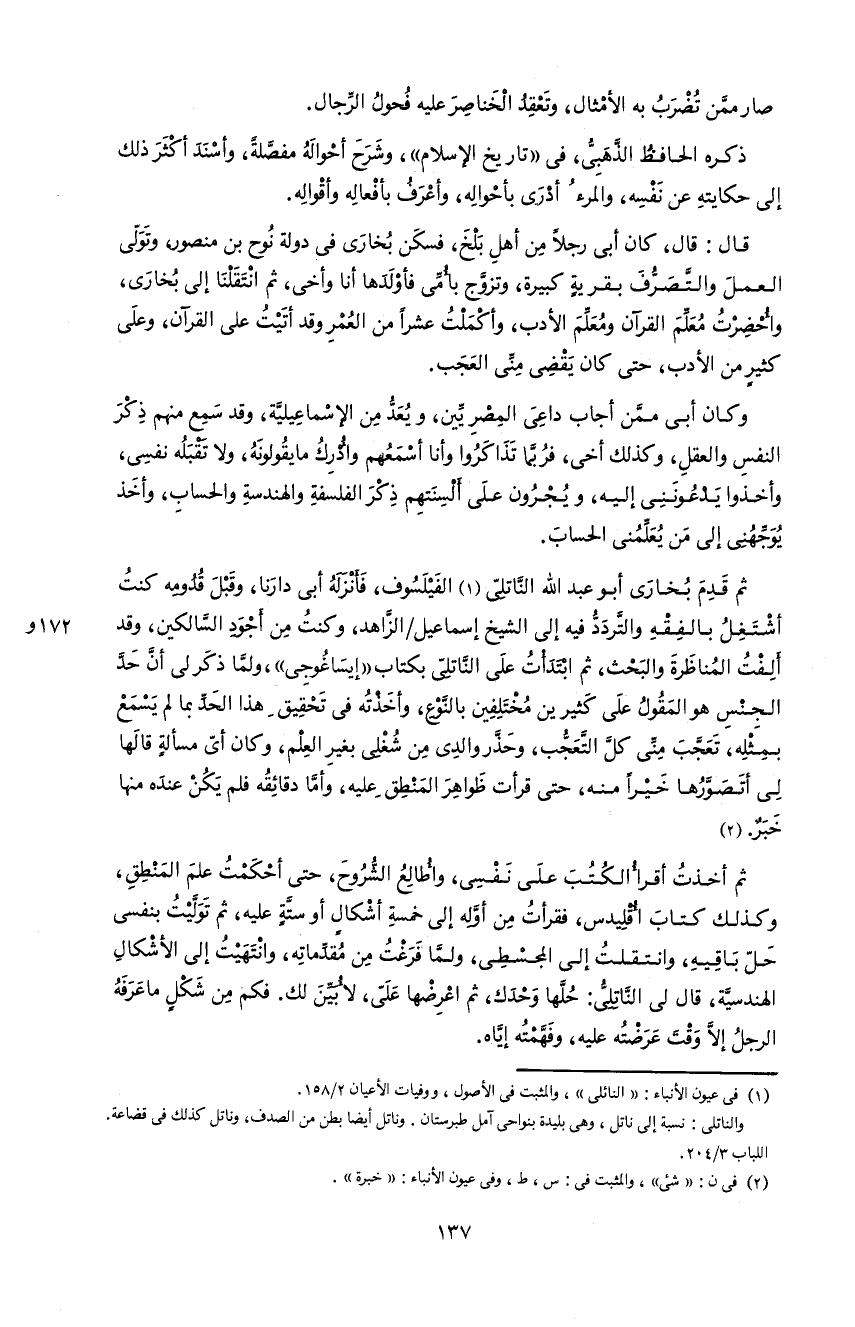 ثم قدم بخارى أبو عبد اللّه النّاتلىّ 1 الفيلسوف، فأنزله أبى دارنا، و قبل قدومه كنت أشتغل بالفقه و التّرددّ فيه إلى الشيخ إسماعيل/الزّاهد، و كنت من أجود السّالكين، و قد ألفت المناظرة و البحث، ثم ابتدأت على النّاتلىّ بكتاب «إيساغوجى»، و لمّا ذكر لى أنّ حدّ الجنس هو المقول على كثيرين مختلفين بالنّوع، و أخذته فى تحقيق هذا الحدّ بما لم يسمع بمثله، تعجّب منّى كلّ التّعجّب، و حذّر والدى من شغلى بغير العلم، و كان أىّ مسألة قالها لى أتصوّرها خيرا منه، حتى قرأت ظواهر المنطق عليه، و أمّا دقائقه فلم يكن عنده منها خبر. 2