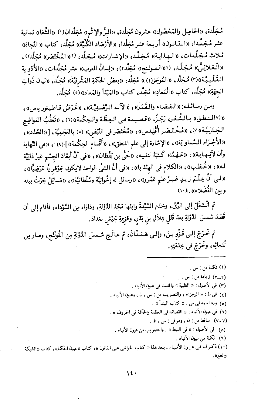 140 مجلّدة، «الحاصل و المحصول» عشرون مجلّدة، «البرّ و الإثم» مجلّدان 1 «الشّفا» ثمانية عشر مجلّدا، «القانون» أربعة عشر مجلّدا، «الأرصاد الكلّيّة» مجلّد، كتاب «النّجاة» ثلاث مجلّدات، «الهداية» مجلّد، «الإشارات» مجلّد، 2 «المختصر» مجلّد 2، «العلائىّ» مجلّد، 2 «القولنج» مجلّد 2، «لسان العرب» عشر مجلّدات، «الأدوية القلبيّة» 3 مجلّد، «الموجز 4» مجلّد، «بعض الحكمة المشرقيّة» مجلّد، «بيان ذوات الجهة» مجلّد، كتاب «المعاد» مجلّد، كتاب «المبدأ و المعاد» 5 مجلّد.