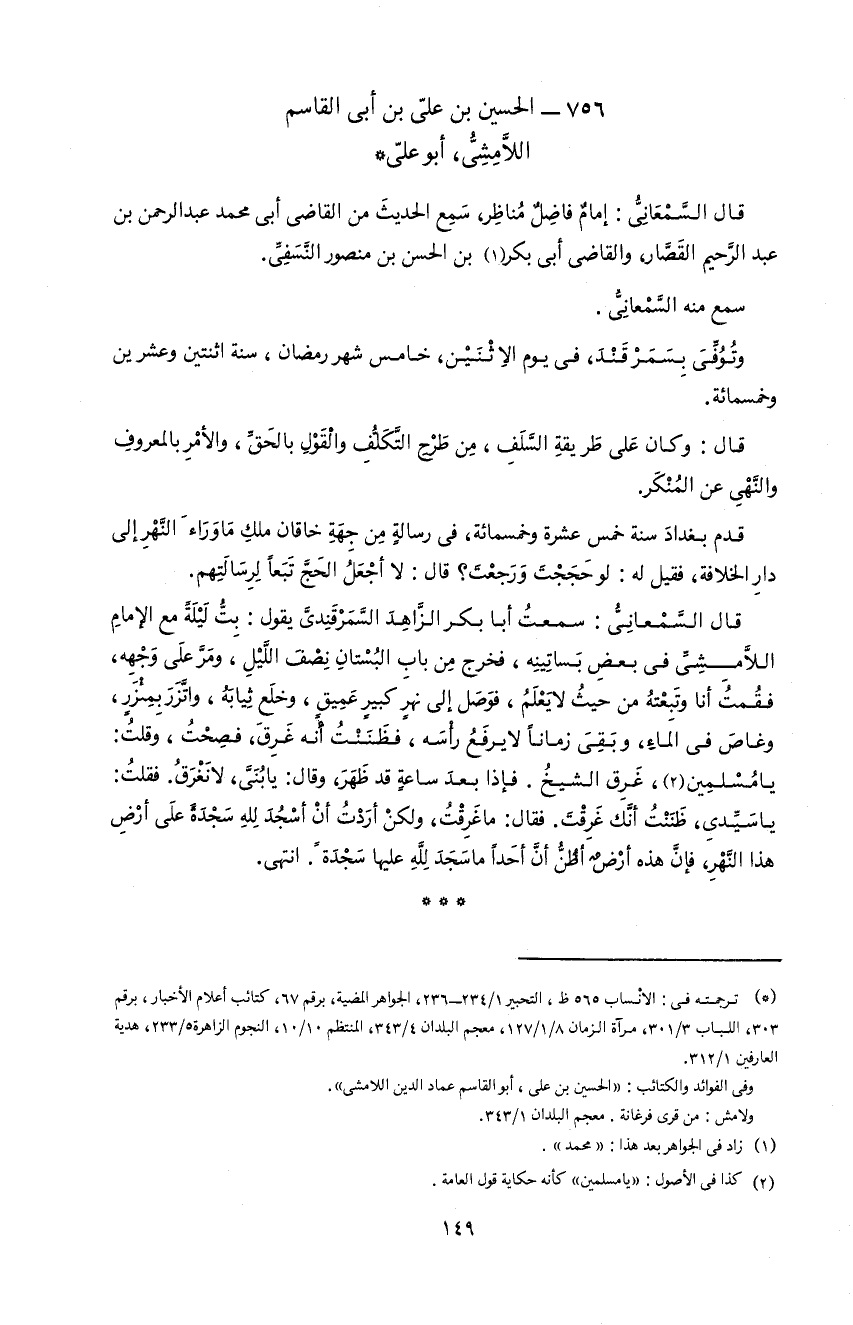 *) ترجمته فى: الأنساب 565 ظ، التحبير 1/ 234 - 236، الجواهر المضية، برقم 67، كتائب أعلام الأخيار، برقم 303، اللباب 3/ 301، مرآة الزمان 8/ 1 / 127، معجم البلدان 4/ 343، المنتظم 10/ 10، النجوم الزاهرة 5/ 233، هدية العارفين 1/ 312. و فى الفوائد و الكتائب: «الحسين بن على، أبو القاسم عماد الدين اللامشى». و لامش: من قرى فرغانة. معجم البلدان 1/ 343.