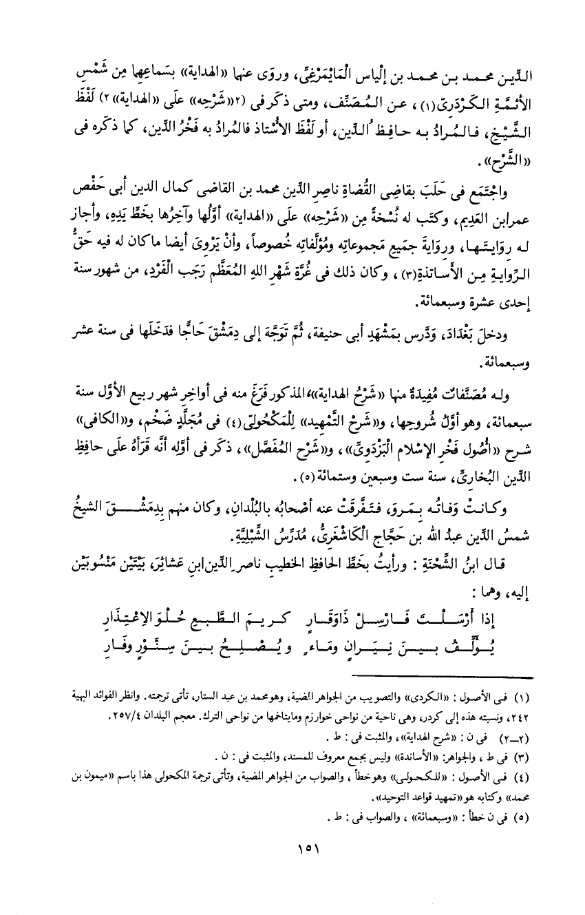 151 الدّين محمد بن محمد بن إلياس المايمرغىّ، و روى عنهما «الهداية» بسماعهما من شمس الأئمّة الكردرىّ 1، عن المصنّف، و متى ذكر فى 2 «شرحه» على «الهداية» 2 لفظ الشّيخ، فالمراد به حافظ الدّين، أو لفظ الأستاذ فالمراد به فخر الدّين، كما ذكره فى «الشّرح».