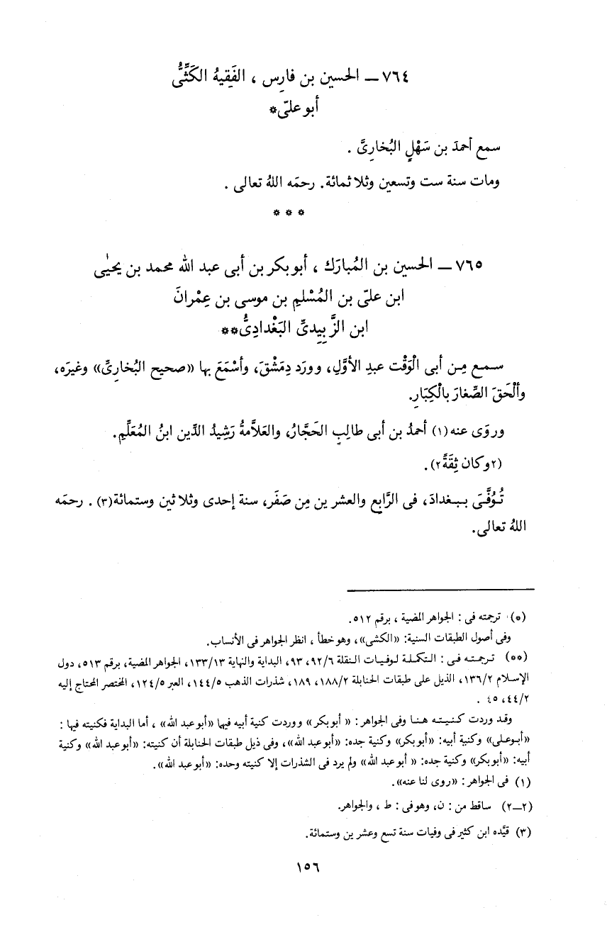 **) ترجمته فى: التكملة لوفيات النقلة 6/ 92، 93، البداية و النهاية 13/ 133، الجواهر المضية، برقم 513، دول الإسلام 2/ 136، الذيل على طبقات الحنابلة 2/ 188، 189، شذرات الذهب 5/ 144، العبر 5/ 124، المختصر المحتاج إليه 2/ 44، 45. و قد وردت كنيته هنا و فى الجواهر: «أبو بكر» و وردت كنية أبيه فيهما «أبو عبد اللّه»، أما البداية فكنيته فيها: «أبو على» و كنية أبيه: «أبو بكر» و كنية جده: «أبو عبد اللّه»، و فى ذيل طبقات الحنابلة أن كنيته: «أبو عبد اللّه» و كنية أبيه: «أبو بكر» و كنية جده: «أبو عبد اللّه» و لم يرد فى الشذرات إلا كنيته وحده: «أبو عبد اللّه».