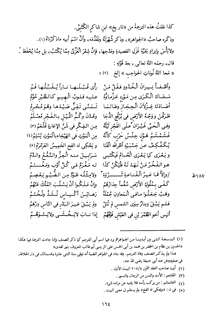 1) النسخة التى بين أيدينا من الجواهر لم يرد فيها اسم أبى المترجم كما ذكر المصنف و إنما جاءت الترجمة فيها هكذا «الحسين بن نظام بن الخضر بن محمد بن أبى الحسن على الزينبى أبو طالب المعروف بنور الهدى» هذا و لم يذكر المصنف وفاة المترجم. و قد جاء فى الجواهر المضية أنه توفى سنة اثنتى عشرة و خمسمائة، فى دار الخلافة، فى صفر، و دفن عند أبى حنيفة رضى اللّه عنه.