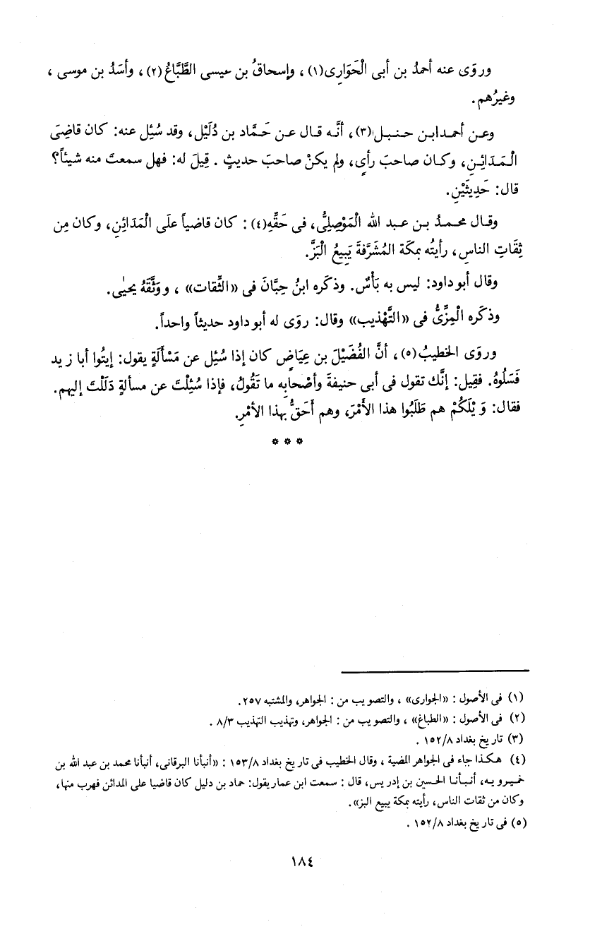 و روى الخطيب 5، أنّ الفضيل بن عياض كان إذا سئل عن مسألة يقول: إيتوا أبا زيد فسلوه. فقيل: إنّك تقول فى أبى حنيفة و أصحابه ما تقول، فإذا سئلت عن مسألة دللت إليهم.
