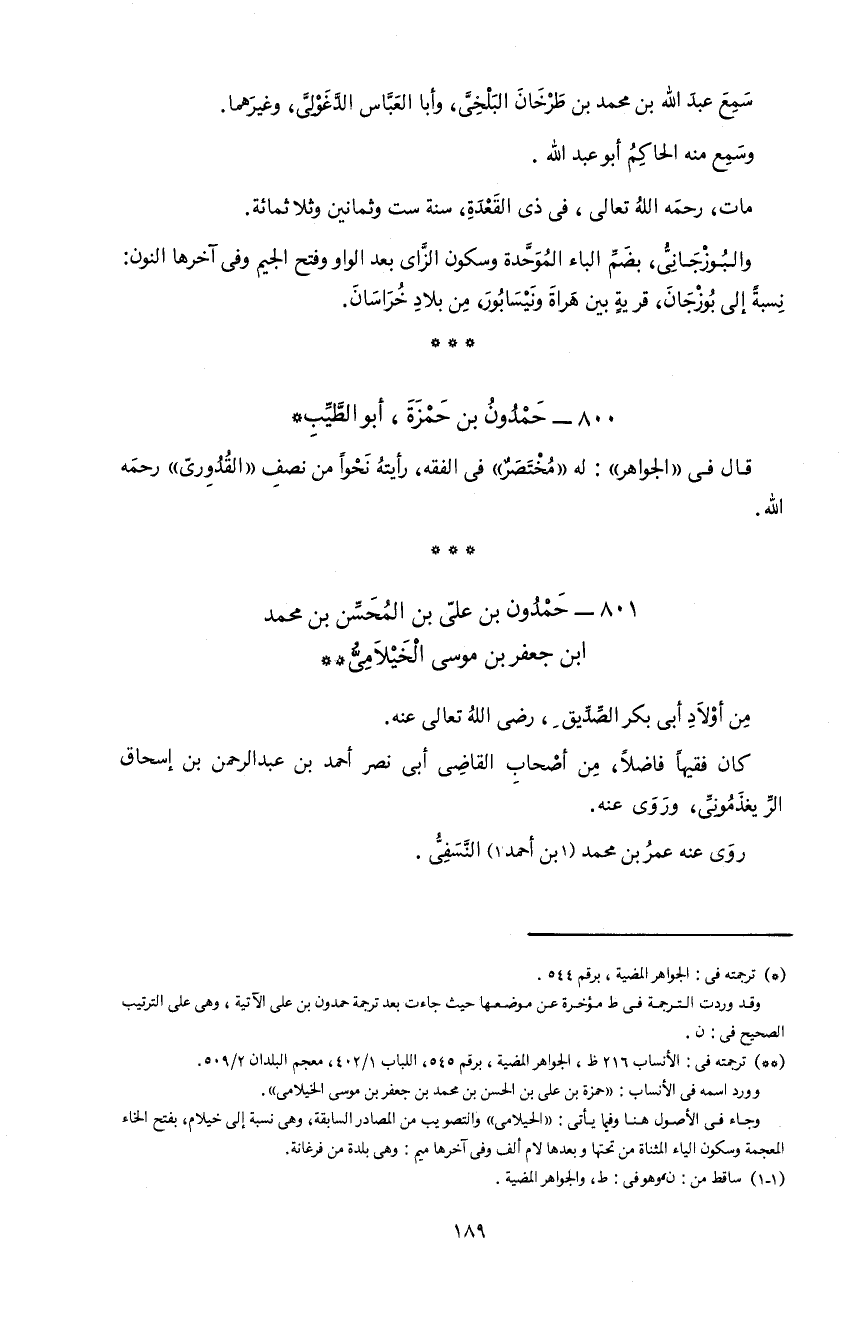**) ترجمته فى: الأنساب 216 ظ، الجواهر المضية، برقم 545، اللباب 1/ 402، معجم البلدان 2/ 509. و ورد اسمه فى الأنساب: «حمزة بن على بن الحسن بن محمد بن جعفر بن موسى الخيلامى». و جاء فى الأصول هنا و فيما يأتى: «الحيلامى» و التصويب من المصادر السابقة، و هى نسبة إلى خيلام، بفتح الخاء المعجمة و سكون الياء المثناة من تحتها و بعدها لام ألف و فى آخرها ميم: و هى بلدة من فرغانة.