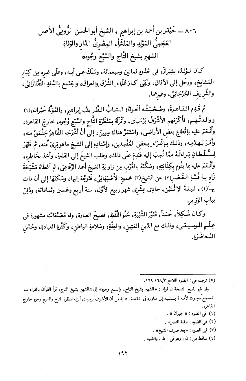 806 - حيدر بن أحمد بن إبراهيم، الشيخ أبو الحسن الرّومىّ الأصل العجمىّ المولد و المنشأ، المصرىّ الدّار و الوفاة الشهير بشيخ التّاج و السّبع وجوه *