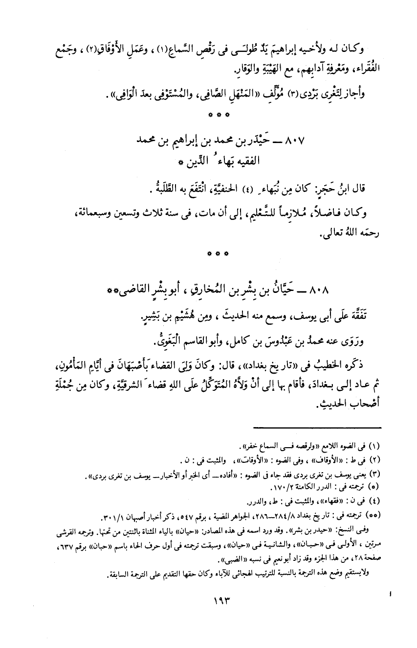 **) ترجمته فى: تاريخ بغداد 8/ 284 - 286، الجواهر المضية، برقم 547، ذكر أخبار أصبهان 1/ 301. و فى النسخ: «حيدر بن بشر». و قد ورد اسمه فى هذه المصادر: «حيان» بالياء المثناة باثنتين من تحتها. و ترجمه القرشى مرتين، الأولى فى «حبان»، و الثانية فى «حيان»، و سبقت ترجمته فى أول حرف الحاء باسم «حبان» برقم 637، صفحة 28، من هذا الجزء و قد زاد أبو نعيم فى نسبه «الضبى». و لا يستقيم وضع هذه الترجمة بالنسبة للترتيب الهجائى للآباء و كان حقها التقديم على الترجمة السابقة.