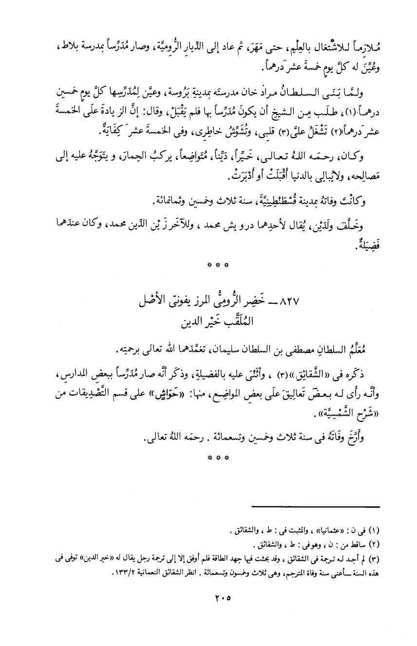 3) لم أجد له ترجمة فى الشقائق، و قد بحثت فيها جهد الطاقة فلم أوفق إلا إلى ترجمة رجل يقال له «خير الدين» توفى فى هذه السنة-أعنى سنة وفاة المترجم، و هى ثلاث و خمسون و تسعمائة. انظر الشقائق النعمانية 2/ 133.