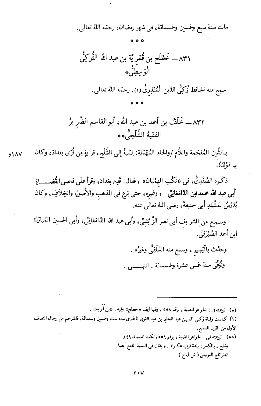 **) ترجمته فى: الجواهر المضية، برقم 559، نكت الهميان 149. و شلح، بالكسر: بلدة قرب عكبراء. و يقال فى النسبة الفتح أيضا. انظر تاج العروس (ش ل ح).