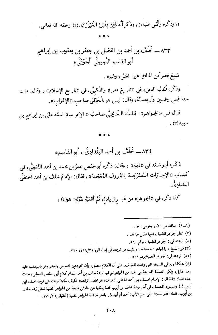 4) هكذا ورد فى النسخة التى وقعت للمؤلف، على أن الكلام متصل، و أن الترجمتين لشخص واحد، و هو ما سيعقب عليه بعد قليل، و لكن النسخة المطبوعة فى الهند من الجواهر تتم فيها ترجمة خلف بن أحمد بتمام كلام أبى حفص النسفى، حيث جاء فيها: «فقال: الإمام خلف بن أحمد الحنفى البغدادى هو خلف الزاهد» فكيف تكون ترجمته هى ترجمة خلف ابن أيوب!!! و سيورد المصنف فى آخر ترجمة خلف بن أيوب قصة ينقلها عن هامش نسخة من الجواهر المضية تمثل زهد خلف بن أيوب، فلعله اعتبر الخلاف فى اسم الأب: أحمد أم أيوب!. و انظر حاشية الجواهر المضية (تحقيقى) 2/ 170.