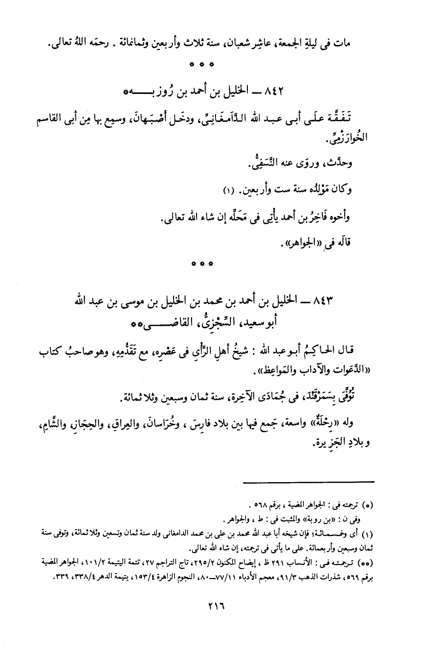 843 - الخليل بن أحمد بن محمد بن الخليل بن موسى بن عبد اللّه أبو سعيد، السّجزىّ، القاضى **