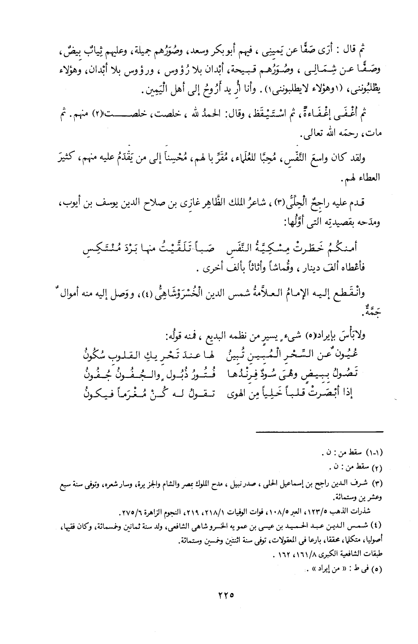 4) شمس الدين عبد الحميد بن عيسى بن عمويه الخسروشاهى الشافعى، ولد سنة ثمانين و خمسمائة، و كان فقيها، أصوليا، متكلما، محققا، بارعا فى المعقولات، توفى سنة اثنتين و خمسين و ستمائة. طبقات الشافعية الكبرى 8/ 161، 162.