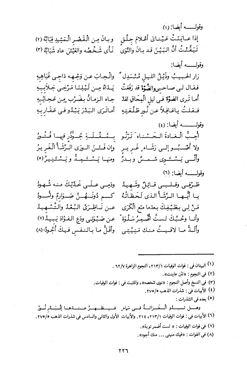 6) الأبيات فى: فوات الوفيات 1/ 213، 214. و الأبيات الأول و الثانى و السادس فى شذرات الذهب 5/ 275.