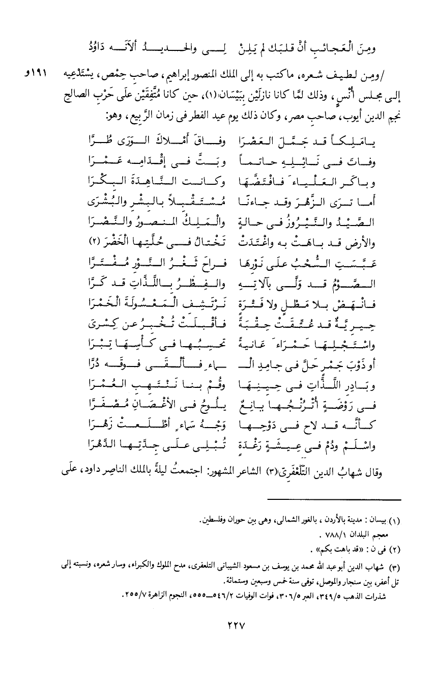 و قال شهاب الدين التّلّعفرىّ 3 الشاعر المشهور: اجتمعت ليلة بالملك الناصر داود، على