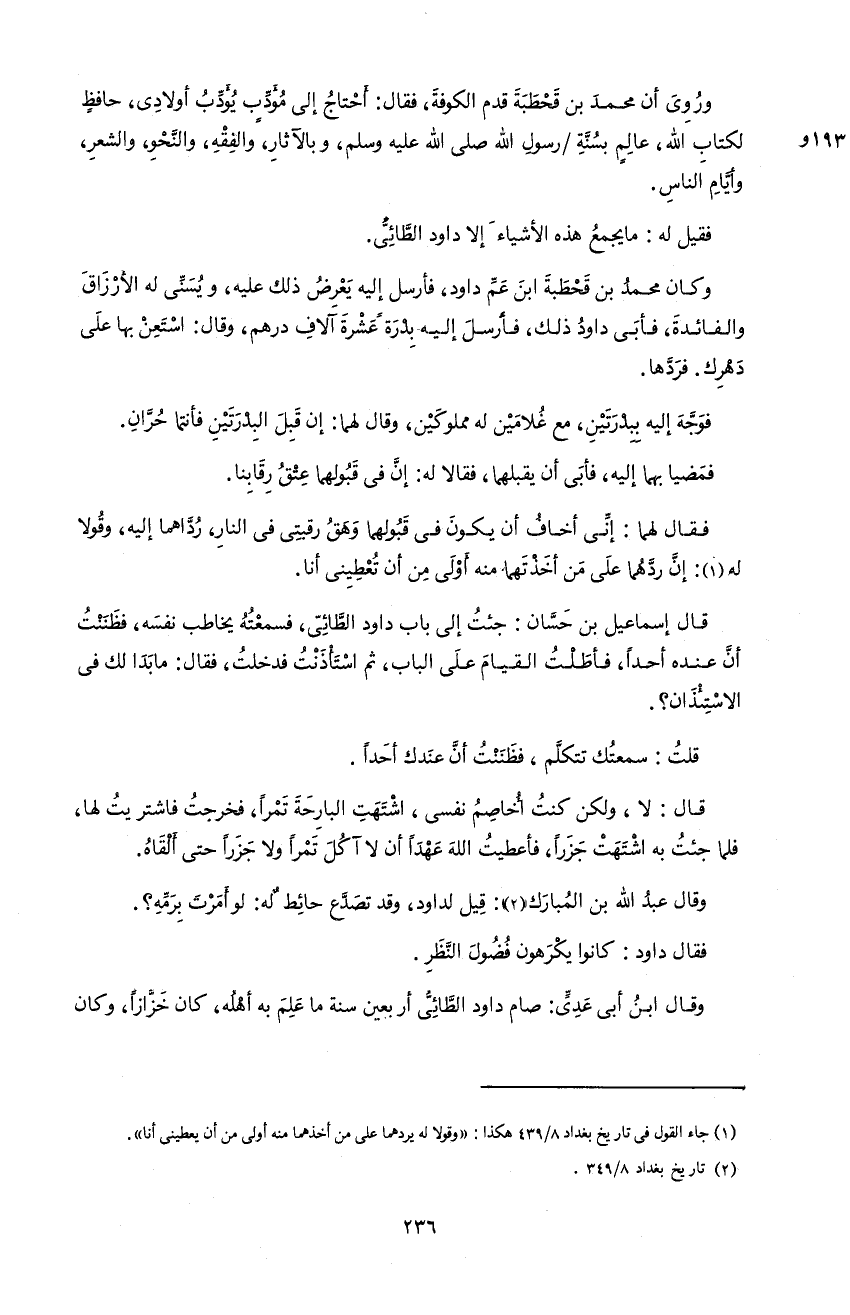 1) جاء القول فى تاريخ بغداد 8/ 439 هكذا: «و قولا له يردهما على من أخذهما منه أولى من أن يعطينى أنا».