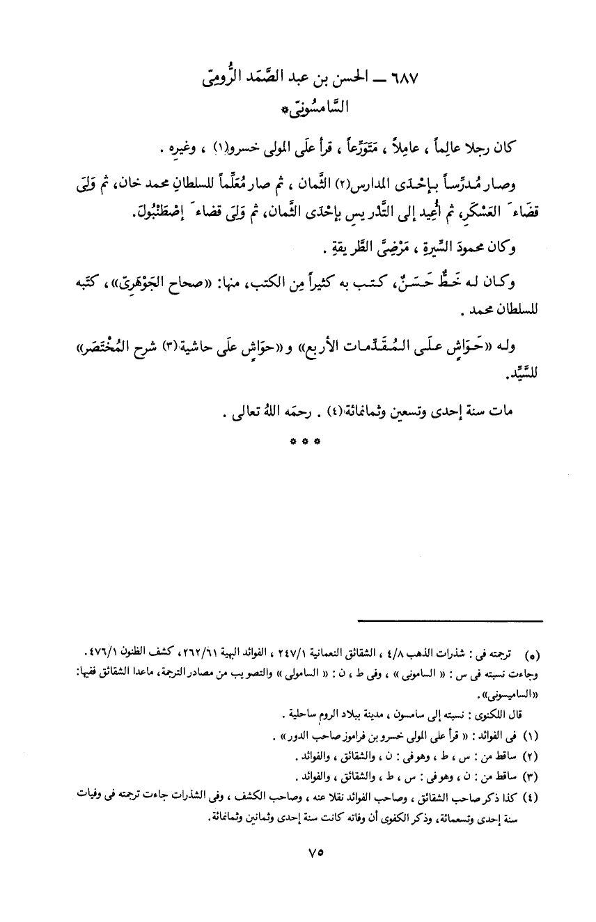 *) ترجمته فى: شذرات الذهب 8/ 4، الشقائق النعمانية 1/ 247، الفوائد البهية 61/ 262، كشف الظنون 1/ 476. و جاءت نسبته فى س: «السامونى»، و فى ط، ن: «السامولى» و التصويب من مصادر الترجمة، ما عدا الشقائق ففيها: «الساميسونى». قال اللكنوى: نسبته إلى سامسون، مدينة ببلاد الروم ساحلية.