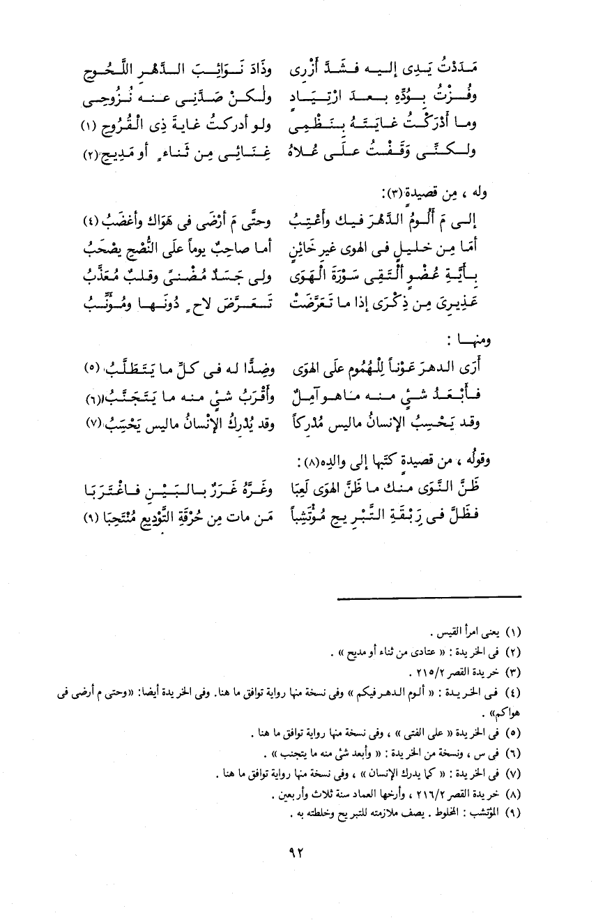 4) فى الخريدة: «ألوم الدهر فيكم» و فى نسخة منها رواية توافق ما هنا. و فى الخريدة أيضا: «و حتى م أرضى فى هواكم».