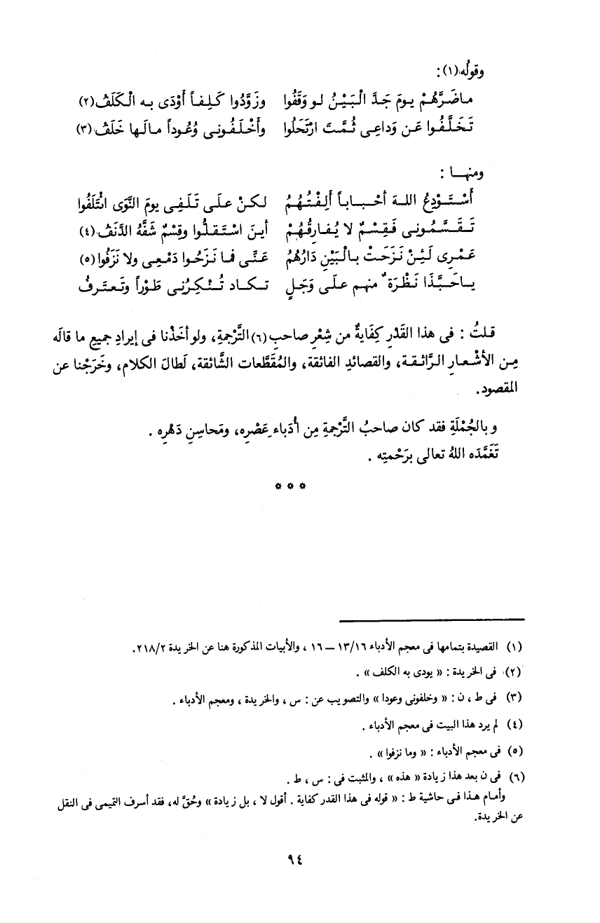 6) فى ن بعد هذا زيادة «هذه»، و المثبت فى: س، ط. و أمام هذا فى حاشية ط: «قوله فى هذا القدر كفاية. أقول لا، بل زيادة» و حقّ له، فقد أسرف التميمى فى النقل عن الخريدة.