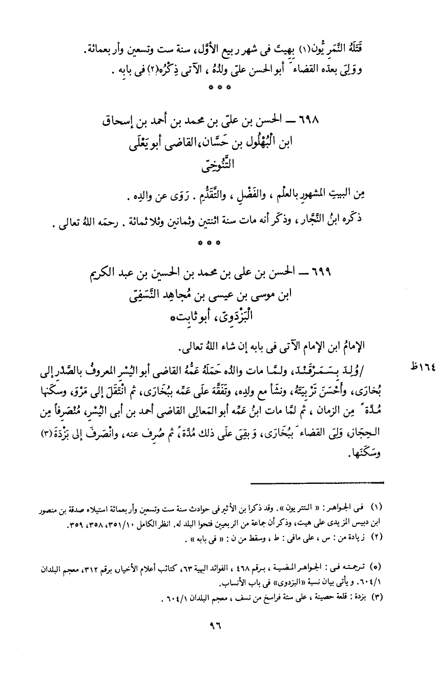 699 - الحسن بن على بن محمد بن الحسين بن عبد الكريم ابن موسى بن عيسى بن مجاهد النّسفىّ البزدوىّ، أبو ثابت *