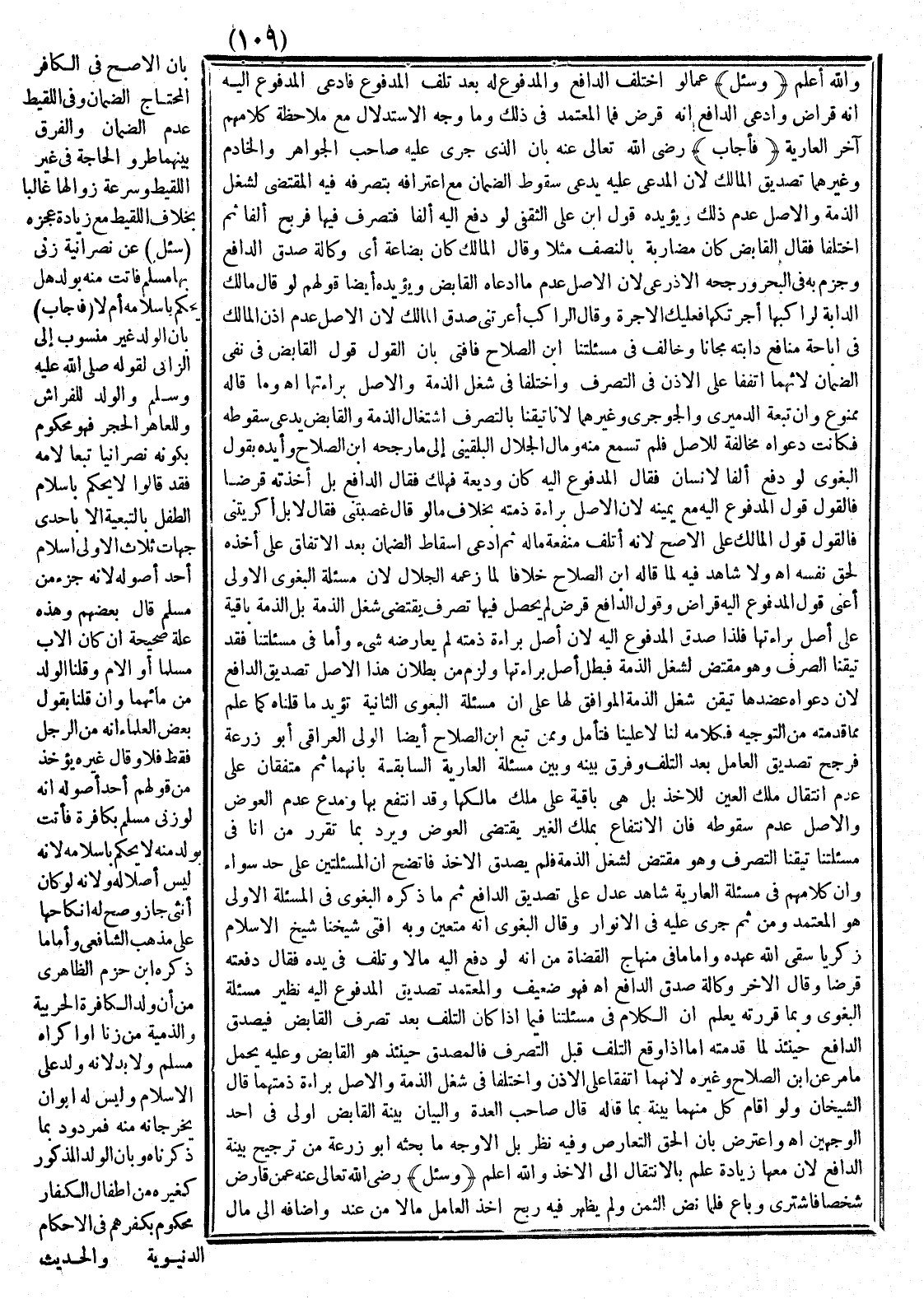 (فَأَجَابَ) - رَضِيَ اللَّهُ تَعَالَى عَنْهُ - بِأَنَّ الَّذِي جَرَى عَلَيْهِ صَاحِبُ الْجَوَاهِرِ وَالْخَادِمِ وَغَيْرُهُمَا تَصْدِيقُ الْمَالِك؛ لِأَنَّ الْمُدَّعَى عَلَيْهِ يَدَّعِي سُقُوطَ الضَّمَانِ مَعَ اعْتِرَافِهِ بِتَصَرُّفِهِ فِيهِ الْمُقْتَضِي لِشَغْلِ الذِّمَّةِ وَالْأَصْلُ عَدَمُ ذَلِكَ وَيُؤَيِّدُهُ قَوْلُ ابْنِ عَلِيٍّ الثَّقَفِيِّ لَوْ دَفَعَ إلَيْهِ أَلْفًا فَتَصَرَّفَ فِيهَا فَرَبِحَ أَلْفًا، ثُمَّ اخْتَلَفَا فَقَالَ الْقَابِضُ كَانَ مُضَارَبَةً بِالنِّصْفِ مَثَلًا وَقَالَ الْمَالِكُ كَانَ بِضَاعَةً أَيْ وَكَالَةً صَدَقَ الدَّافِعُ.