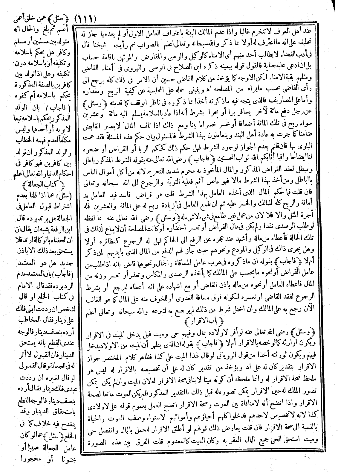 (فَأَجَابَ) بِقَوْلِهِ إنَّ مَا ذَكَرُوهُ فِي هَرَبَ عَامِلِ الْمُسَاقَاةِ وَالْجَمَّالِ وَنَحْوِهِمَا قَاضٍ بِأَنَّهُ إذَا طَلَبَ مِنْ عَامِلِ الْقِرَاضِ أَوْ نَحْوِهِ مَا يُحْسَبُ عَلَى الْمَالِكِ كَمَا يَأْخُذُهُ الرَّصَدِيّ وَالْمِكَاس وَتَعَذَّرَ أَوْ تَعَسَّرَ وَزْنُهُ مِنْ الْمَالِ فَأَعْطَاهُ الْعَامِلُ أَوْ نَحْوُهُ مِنْ مَالِهِ بِإِذْنِ الْقَاضِي أَوْ مَعَ إشْهَادِهِ عَلَى أَنَّهُ أَعْطَاهُ لِيَرْجِعَ أَوْ بِشَرْطِ الرُّجُوعِ لِفَقْدِ الْقَاضِي أَوْ تَعَسُّرِهِ لِكَوْنِهِ فَوْقَ مَسَافَةِ الْعَدْوَى أَوْ لِلْخَوْفِ مِنْهُ عَلَى الْمَالِ كَمَا هُوَ الْغَالِبُ الْآن رَجَعَ بِهِ عَلَى الْمَالِكِ وَإِنْ اخْتَلَّ شَرْطٌ مِنْ ذَلِكَ لَمْ يَرْجِعْ بِهِ لِتَبَرُّعِهِ، وَاَللَّه سُبْحَانه وَتَعَالَى أَعْلَم.
