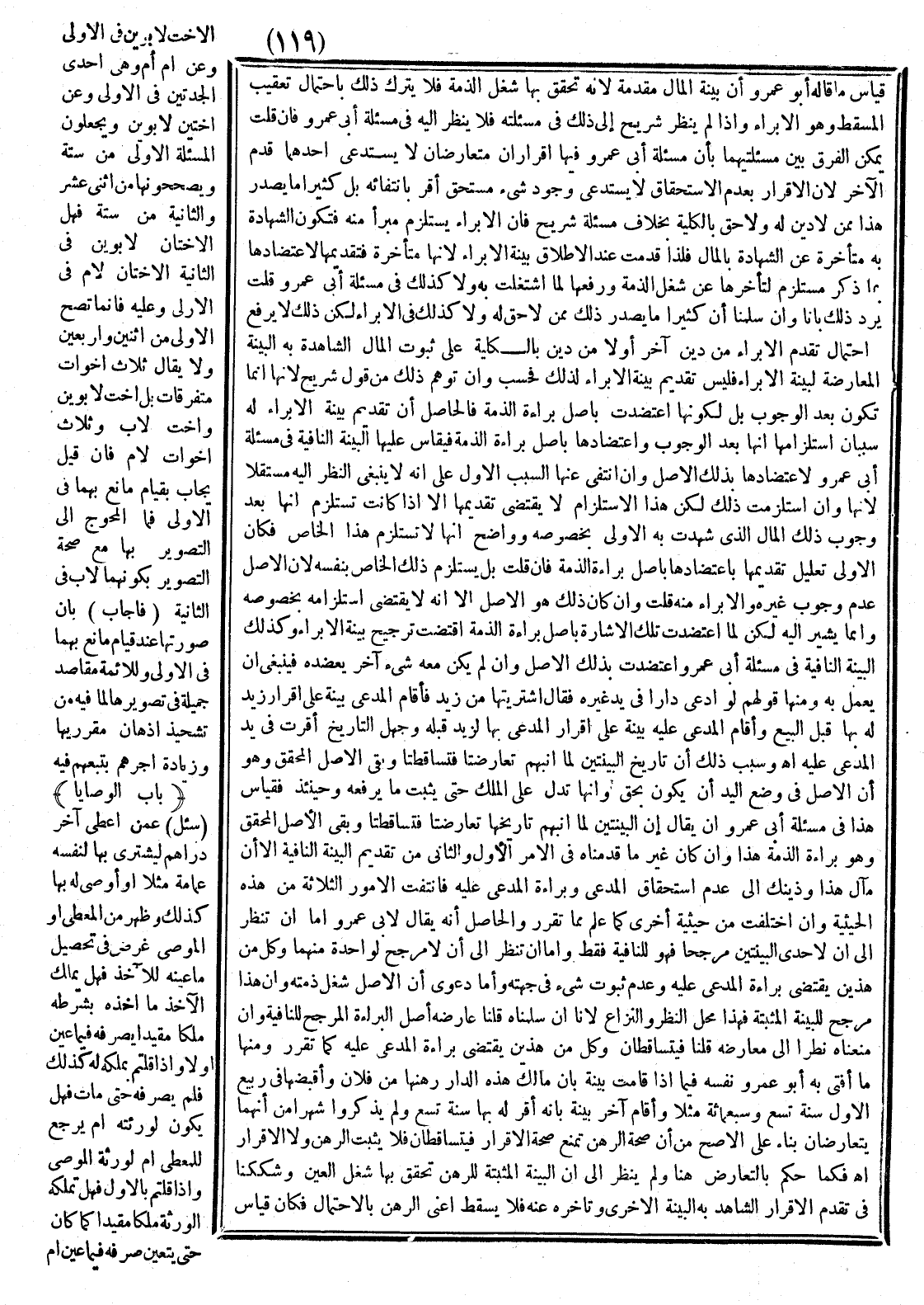 ، وَأَمَّا دَعْوَى أَنَّ الْأَصْلَ شَغْلُ ذِمَّتِهِ وَأَنَّ هَذَا مُرَجِّحٌ لِلْبَيِّنَةِ الْمُثْبِتَةِ فَهَذَا مَحَلُّ النَّظَرِ وَالنِّزَاعِ؛ لِأَنَّا إنْ سَلَّمْنَاهُ قُلْنَا عَارَضَهُ أَصْلُ الْبَرَاءَةِ الْمُرَجِّحُ لِلنَّافِيَةِ وَإِنْ مَنَعْنَاهُ نَظَرًا إلَى مُعَارِضِهِ قُلْنَا فَيَتَسَاقَطَانِ وَكُلٌّ مِنْ هَذَيْنِ يَقْتَضِي بَرَاءَةَ الْمُدَّعَى عَلَيْهِ كَمَا تَقَرَّرَ وَمِنْهَا مَا أَفْتَى بِهِ أَبُو عَمْرٍو وَنَفْسُهُ فِيمَا إذَا قَامَتْ بَيِّنَةٌ بِأَنَّ مَالِكَ هَذِهِ الدَّارِ رَهَنَهَا مِنْ فُلَانٍ وَأَقْبَضَهَا فِي رَبِيعٍ الْأَوَّلِ سَنَةَ تِسْعٍ وَسَبْعِمِائَةٍ مَثَلًا وَأَقَامَ آخَرُ بَيِّنَةً بِأَنَّهُ أَقَرَّ لَهُ بِهَا سَنَةَ تِسْعٍ وَلَمْ يَذْكُرُوا شَهْرًا مِنْ أَنَّهُمَا يَتَعَارَضَانِ بِنَاءً عَلَى الْأَصَحِّ مِنْ أَنَّ صِحَّةَ الرَّهْنِ تَمْنَعُ صِحَّةَ الْإِقْرَارِ فَيَتَسَاقَطَانِ فَلَا يَثْبُتُ الرَّهْنُ وَلَا الْإِقْرَارُ. اهـ. فَكَمَا حُكِمَ بِالتَّعَارُضِ هُنَا وَلَمْ يُنْظَرْ إلَى أَنَّ الْبَيِّنَةَ الْمُثْبِتَةِ لِلرَّهْنِ تَحَقَّقَ بِهَا شُغْلُ الْعَيْنِ وَشَكَكْنَا فِي تَقَدُّمِ الْإِقْرَارِ الشَّاهِدِ بِهِ الْبَيِّنَةُ الْأُخْرَى وَتَأَخُّرِهِ عَنْهُ فَلَا يَسْقُطُ أَعْنِي الرَّهْنَ بِالِاحْتِمَالِ فَكَانَ قِيَاسُ