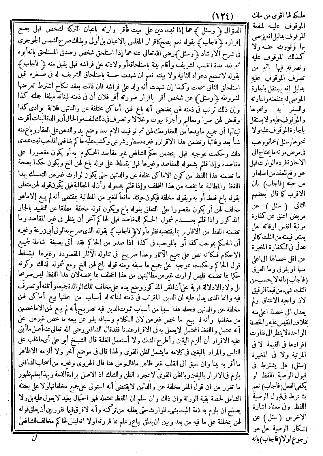 (فَأَجَابَ) بِقَوْلِهِ الَّذِي صَرَّحَ بِهِ الْوَلِيُّ أَبُو زُرْعَةَ وَغَيْرُهُ أَنَّ الْحُكْمَ بِمُوجِبِ كَذَا أَوْ بِالْمُوجِبِ فِي كَذَا إذَا صَدَرَ مِنْ الْحَاكِمِ فَقَدْ أَتَى بِصِيغَةٍ شَامِلَةٍ لِجَمِيعِ الْأَحْكَامِ فَكَأَنَّهُ نَصَّ عَلَى جَمِيعِ الْآثَارِ وَهَذَا صَرِيحٌ فِي تَنَاوُلِهِ الْآثَارَ الْمَقْصُودَةَ وَغَيْرَهَا فَيَتَسَلَّطُ قَوْلُ الْحَاكِمِ وَحَكَمْتُ بِمُوجِبِهِ عَلَى جَمِيعِ مَا سَبَقَهُ وَمِنْهُ قَوْلُهُ بَاعَ لَهُنَّ إلَخْ وَمَعَ شُمُولِهِ لِذَلِكَ وَكَوْنِهِ حُكْمًا بِمَا يَضْمَنُهُ فَلَيْسَ لِوَارِثٍ غَيْرِهِنَّ مُطَالَبَتُهُنَّ مِنْ هَذَا الْمُخْلِف بِمَا يَخُصُّهُ؛ لِأَنَّ هَذَا اللَّفْظَ لَيْسَ صَرِيحًا بَلْ وَلَا دَالًّا دَلَالَةً قَوِيَّةً عَلَى أَنَّ الْمُقِرَّ الْمَذْكُورَ وَضَعَ يَدَهُ عَلَى مُخَلَّفِ تِلْكَ الْوَالِدَةِ جَمِيعِهِ وَأَتْلَفَهُ أَوْ تَصَرَّفَ فِيهِ وَإِنَّمَا الَّذِي يَدُلُّ عَلَيْهِ أَنَّ الدَّيْنَ الْمُتَرَتِّبَ فِي ذِمَّتِهِ لِبَنَاتِهِ لَهُ أَسْبَابٌ مِنْ جُمْلَتِهَا بَيْعُ أَمَاكِنَ لَهُنَّ مُخَلَّفَةً عَنْ وَالِدَتِهِنَّ فَجَعْلُهُ هَذَا سَبَبًا مِنْ أَسْبَابِ ثُبُوتِ الدَّيْنِ فِيهِ تَصْرِيحٌ بِأَنَّهُ لَمْ يَبِعْ لَهُنَّ إلَّا مَا خَصَّهُنَّ مِنْ مُخَلَّفِهَا وَأَنَّهُ لَمْ يَبِعْ مَا خَصَّ غَيْرَهُنَّ؛ لِأَنَّ الْكَلَامَ وَسِيَاقَهُ يَنْبُو عَنْ بَيْعِهِ مَا خَصَّ غَيْرَهُنَّ عَلَى أَنَّهُ مُحْتَمَلٌ وَاللَّفْظُ الْمُحْتَمَلُ لَا يُعْمَلُ بِهِ فِي الْإِقْرَارِ عِنْدَنَا فَقَدْ قَالَ الشَّافِعِيُّ - رَضِيَ اللَّهُ تَعَالَى عَنْهُ - عَنْهُ أَصْلُ مَا أَبْنِي عَلَيْهِ الْإِقْرَارَ أَنْ أَلْزَمَ الْيَقِينَ وَأَطْرَحَ الشَّكَّ وَلَا أَسْتَعْمِلَ الْغَلَبَةَ قَالَ الشَّيْخُ أَبُو عَلِيٍّ أَيْ مَا غَلَبَ عَلَى النَّاسِ وَالْمُرَادُ بِالْيَقِينِ فِي كَلَامِهِ مَا يَشْمَلُ الظَّنَّ الْقَوِيَّ وَلِهَذَا قَالَ فِي مَوْضِعٍ آخَرَ وَلَا أَلْزَمَهُ إلَّا ظَاهِرَ مَا أَقَرَّ بِهِ بَيِّنًا وَإِنْ سَبَقَ إلَى الْقَلْبِ غَيْرُ ظَاهِرٍ مَا قَالَ.