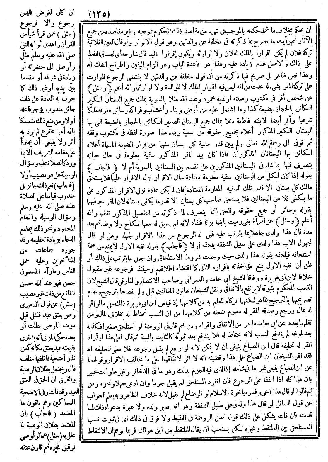 (فَأَجَابَ) بِقَوْلِهِ إذَا كَانَ لِكُلٍّ مِنْ الْبُسْتَانَيْنِ سَقِيَّةٌ مَعْلُومَةٌ مُعْتَادَةٌ حَالَ الْإِقْرَارِ نَزَلَ الْإِقْرَارُ عَلَيْهَا فَلَا يَسْتَحِقُّ مَالِكُ كُلِّ بُسْتَانٍ إلَّا قَدْرَ تِلْكَ السَّقِيَّةِ الْمَعْلُومَةِ الْمُعْتَادَةِ فَإِنْ لَمْ يَكُنْ عَادَةً نَزَلَ الْإِقْرَارُ الْمَذْكُورُ عَلَى مَا يَكْفِي كُلًّا مِنْ الْبُسْتَانَيْنِ فَلَا يَسْتَحِقُّ صَاحِبُ كُلِّ بُسْتَانٍ إلَّا قَدْرَ مَا يَكْفِي بُسْتَانَهُ؛ لِأَنَّ الْمُقِرَّ عَبَّرَ فِيهِمَا بِقَوْلِهِ وَسَائِرُ أَوْ جَمِيعُ حُقُوقِهِ وَالْحَقُّ إنَّمَا يَنْصَرِفُ لِمَا ذَكَرْته مِنْ التَّفْصِيلِ الْمَذْكُورِ تَفَقُّهًا، وَاَللَّهُ أَعْلَمُ.